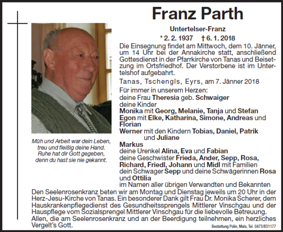 und der Hauspflege vom Sozialsprengel Mittlerer Vinschgau für die liebevolle Betreuung.