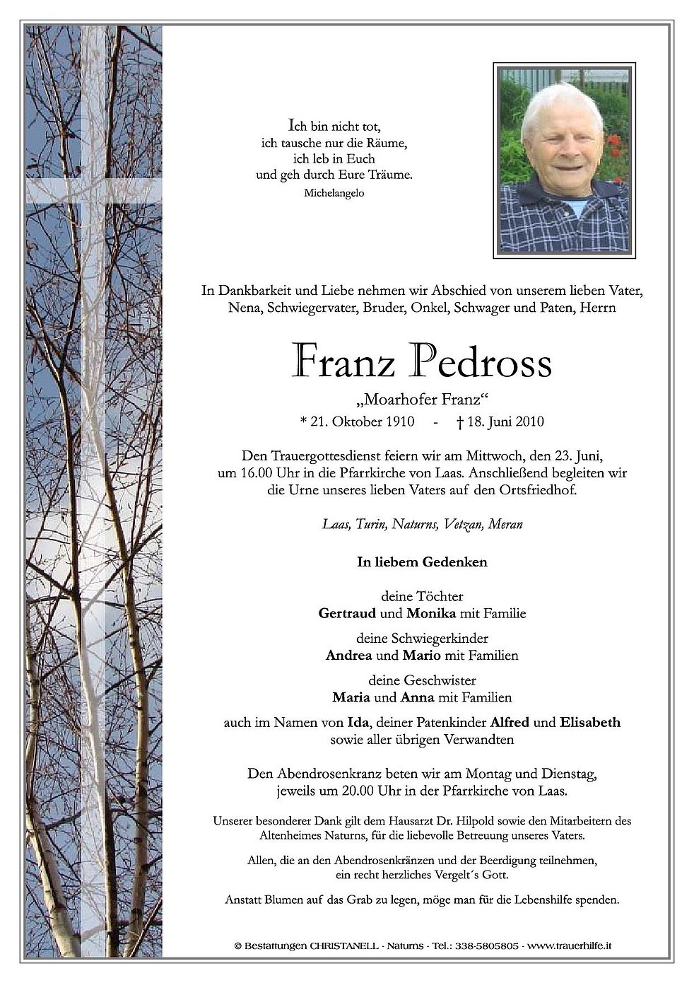 Unserer besonderer Dank gilt dem Hausarzt Dr. Hilpold sowie den Mitarbeitern des Altenheimes Naturns, für die liebevolle Betreuung unseres Vaters.