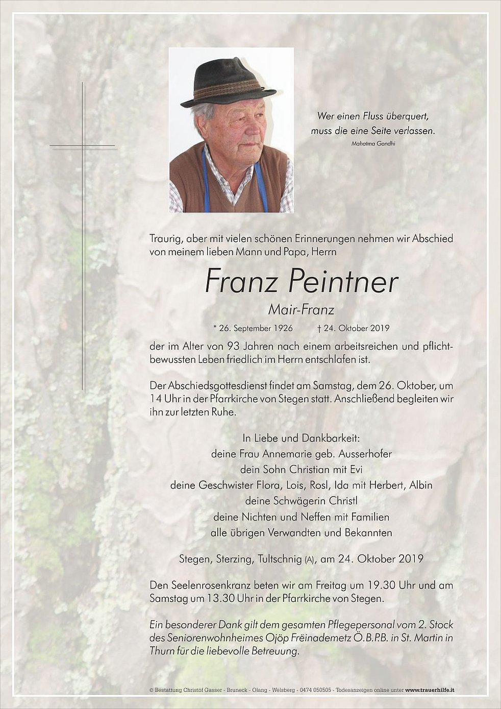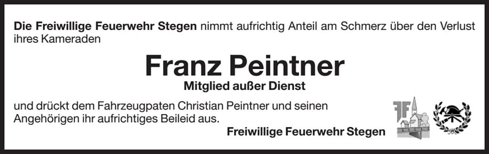 Der Abschiedsgottesdienst findet am Samstag, dem 26. Oktober, um 14 Uhr in der Pfarrkirche von Stegen statt. Anschließend begleiten wir ihn zur letzten Ruhe.
