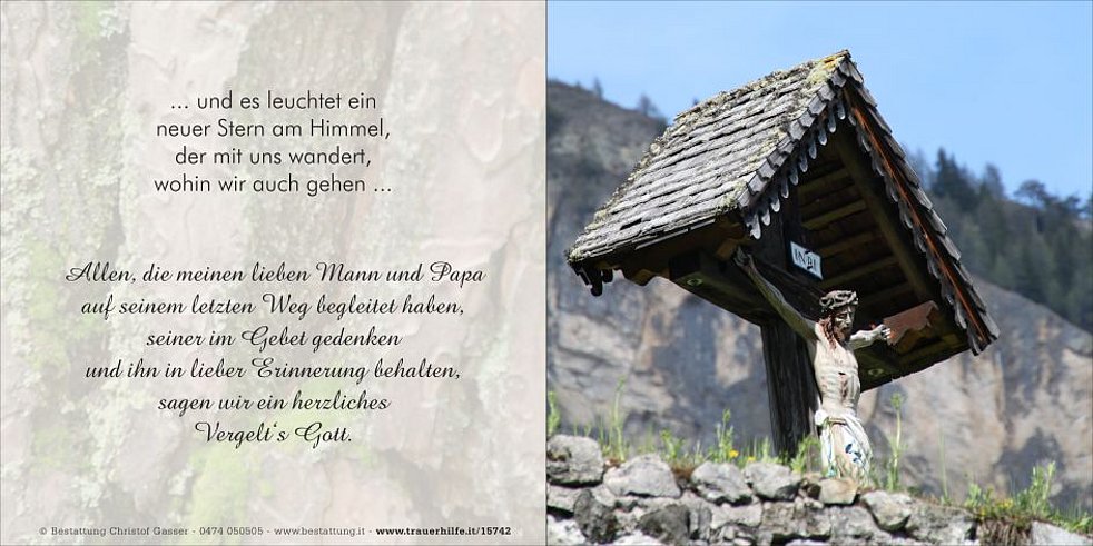 Ein besonderer Dank gilt dem gesamten Pflegepersonal vom 2. Stock des Seniorenwohnheimes Ojöp Frëinademetz Ö.B.P.B. in St. Martin in Thurn für die liebevolle Betreuung.