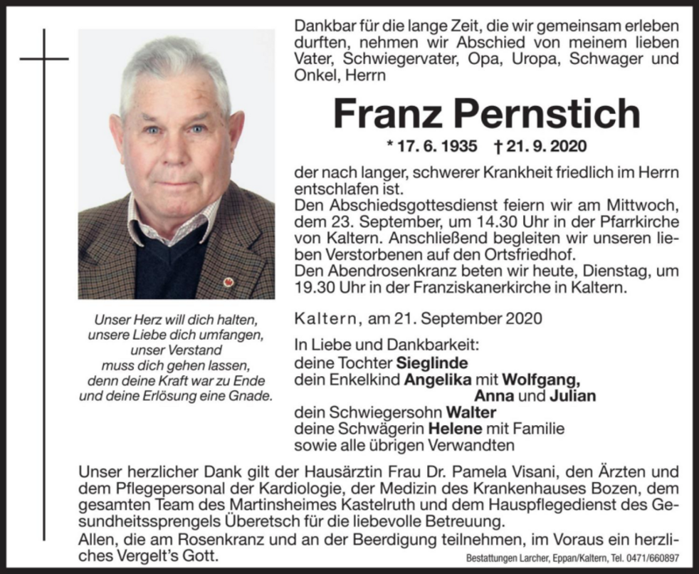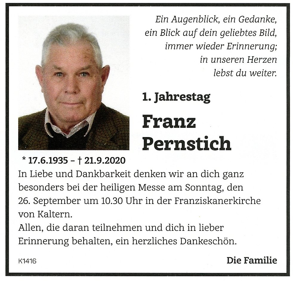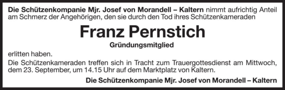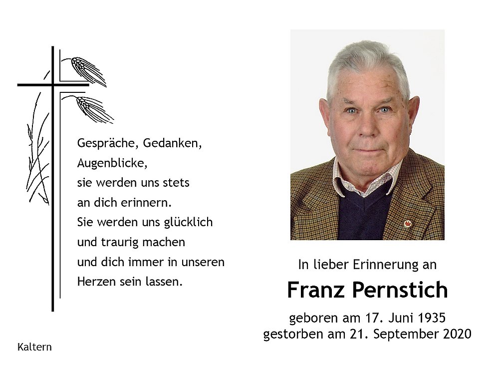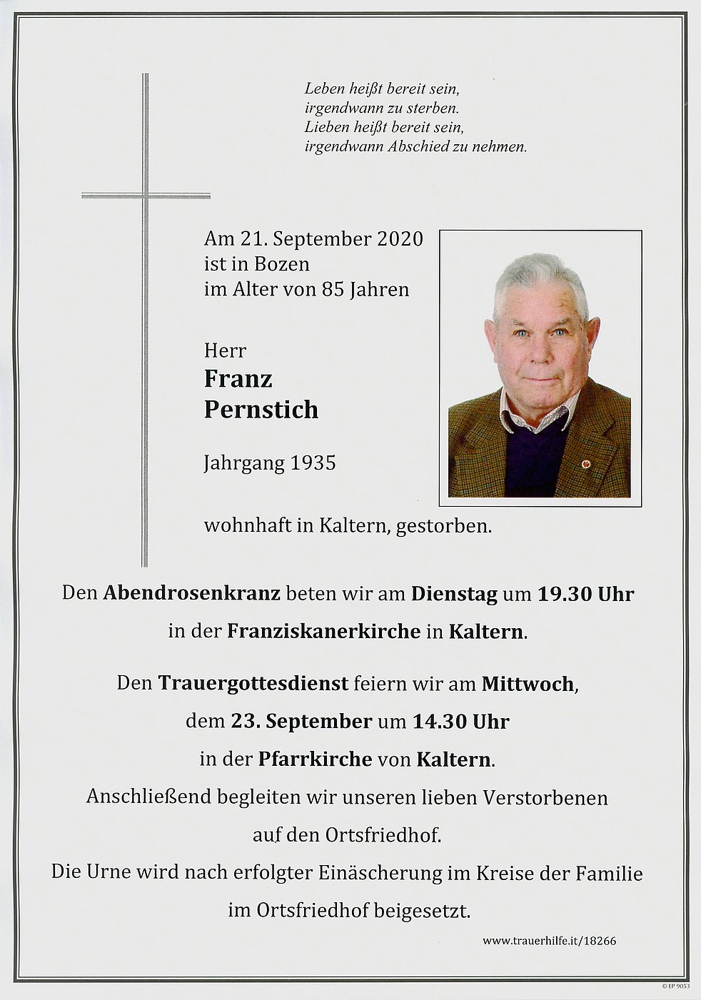 Den Abschiedsgottesdienst feiern wir am Mittwoch, dem 23. September um 14.30 Uhr in der Pfarrkirche von Kaltern. Anschließend begleiten wir unseren lieben Verstorbenen auf den Ortsfriedhof.