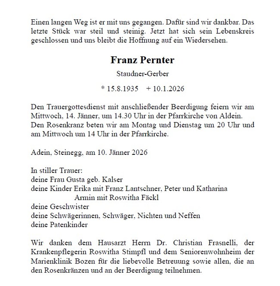 Begräbnisgottesdienst: 14.01. - 14:30 Uhr Aldein