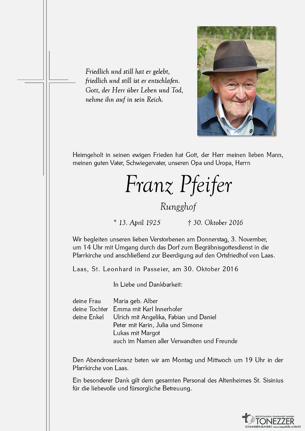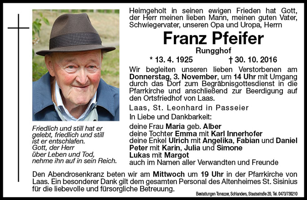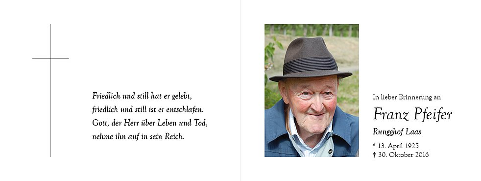 Wir begleiten unseren lieben Verstorbenen am Donnerstag, 3. November, um 14 Uhr mit Umgang durch das Dorf zum Begräbnisgottesdienst in die Pfarrkirche und anschließend zur Beerdigung auf den Ortsfriedhof von Laas.