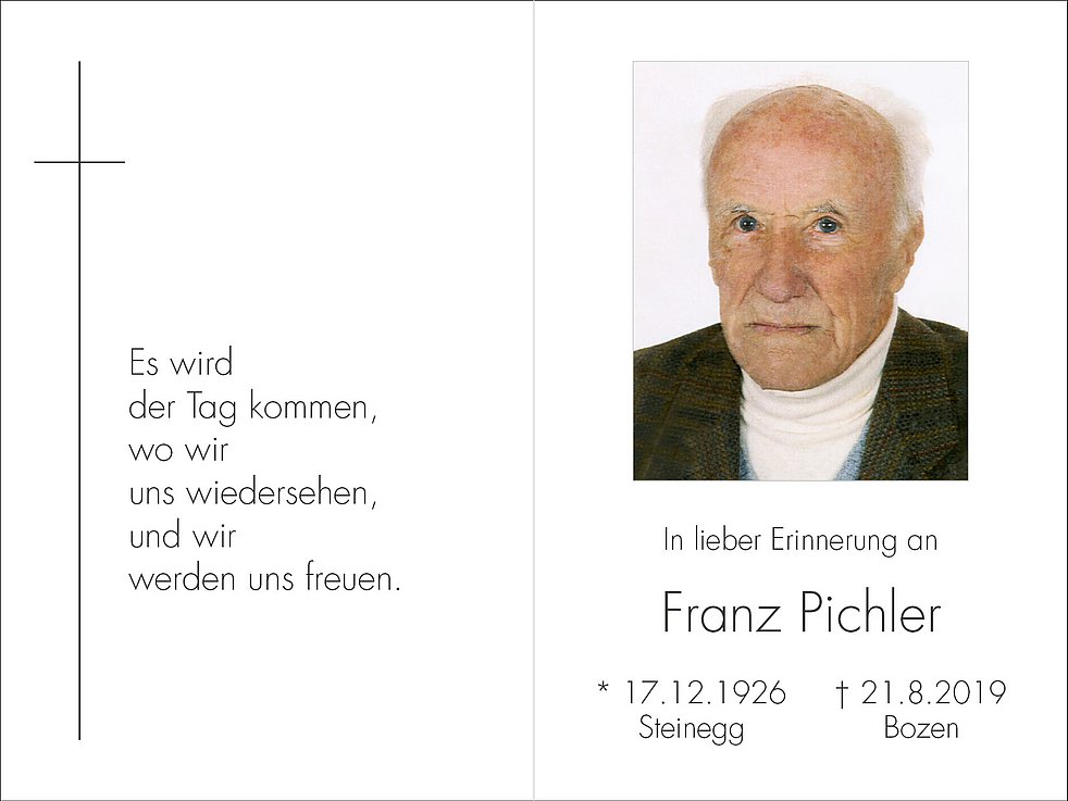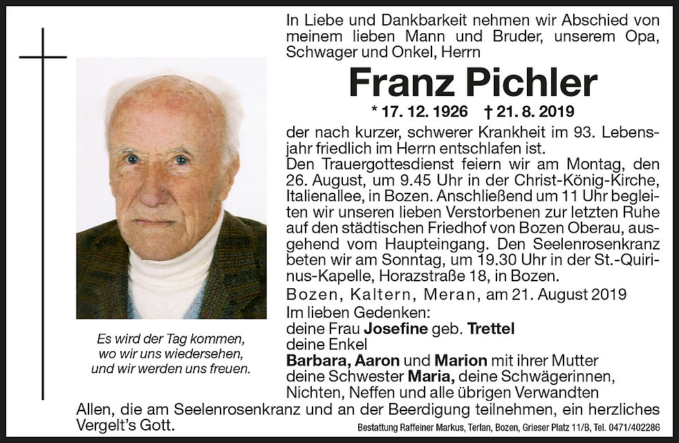 Den Trauergottesdienst feiern wir am Montag, dem 26. August, um 9.45 Uhr in der Christ-König-Kirche, Italienallee in Bozen. Anschließend um 11 Uhr begleiten wir unseren lieben Verstorbenen zur letzten Ruhe auf den städtischen Friedhof von Bozen Oberau, ausgehend vom Haupteingang.