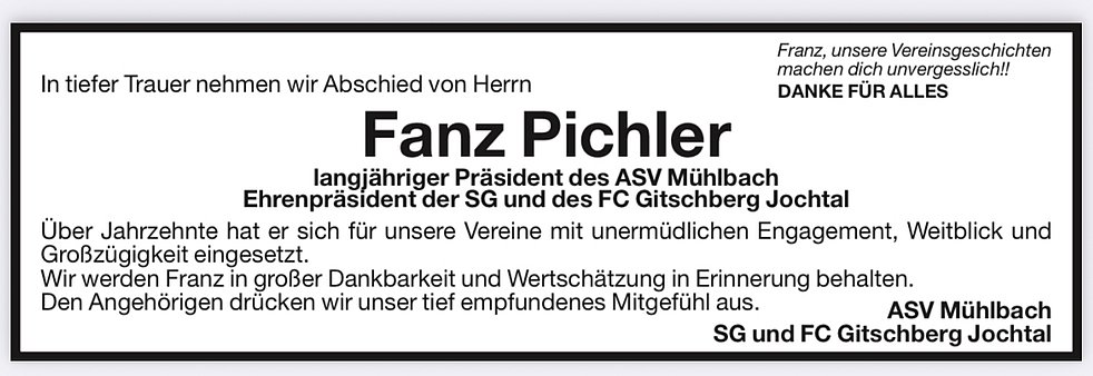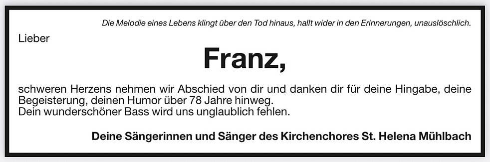 Liebe Mariedl! Betroffen haben wir vom Tod des lieben Franz erfahren. Er hat ein hohes Alter erreicht, aber einen lieben Menschen loslassen zu müssen, ist immer schmerzlich und leidvoll. Wir möchten Dir und Deiner Familie unsere herzliche Anteilnahmr bekunden. Wir denken oft und gerne an die Stunden, die wir miteinander verbringen durften und werden das Andrnken an den Franzl stets im Herzen bewahren. Dir viel Kraft in dieser Zeit des Abschienehmens!