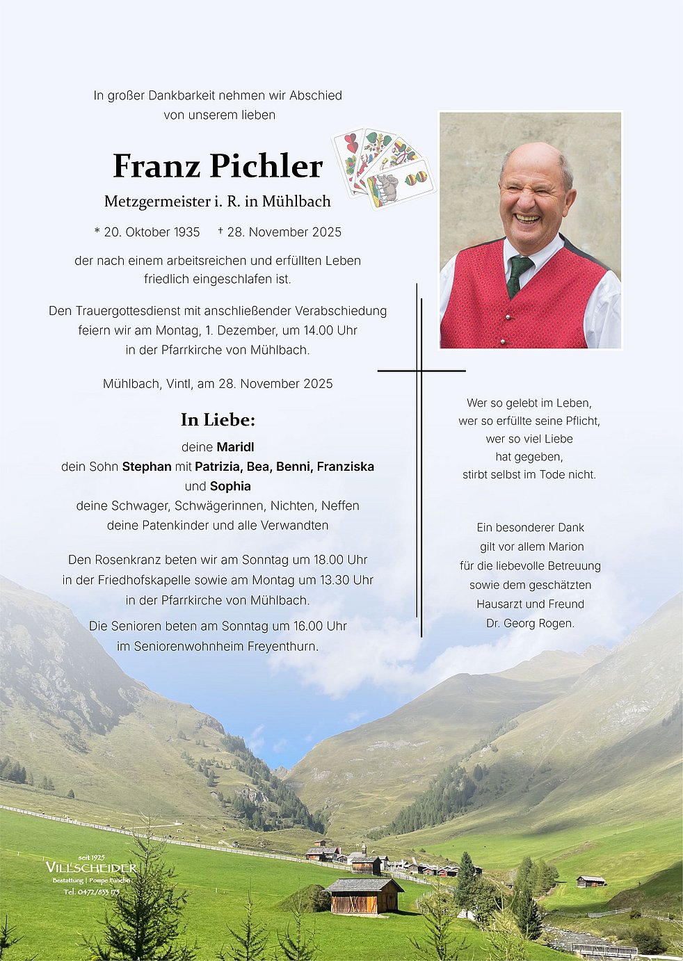 mit großer Betroffenheit haben wir vom Ableben unseres treuen Stammgastes Franz erfahren. Franz war viele Jahre lang ein vertrauter und geschätzter Teil unserer Gemeinschaft in der Weissen Lilie. Besonders seine tägliche Anwesenheit um 17 Uhr, wenn er beim Vierer-Watter die Karten mischte, wird uns unvergessen bleiben.