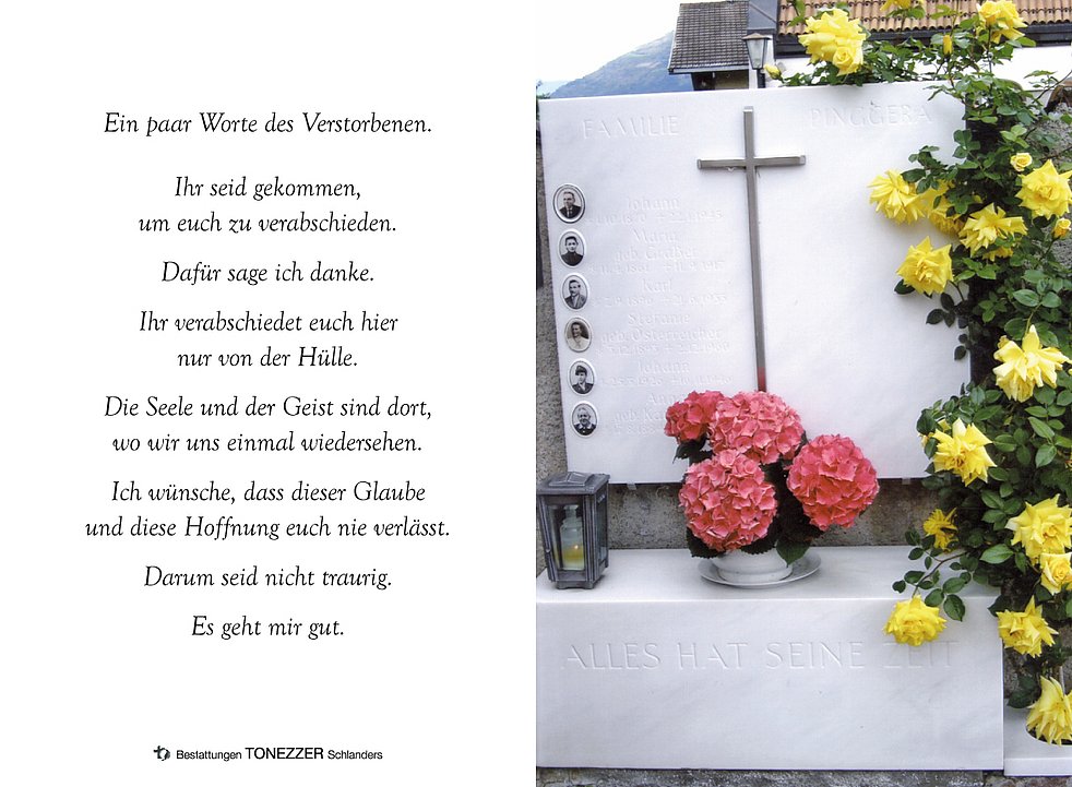Ein besonderer Dank gilt dem Hauskrankenpflegedienst vom Sprengel Mittelvinschgau und dem gesamten Team vom Krankenhaus Schlanders für die liebevolle und fürsorgliche Betreuung.