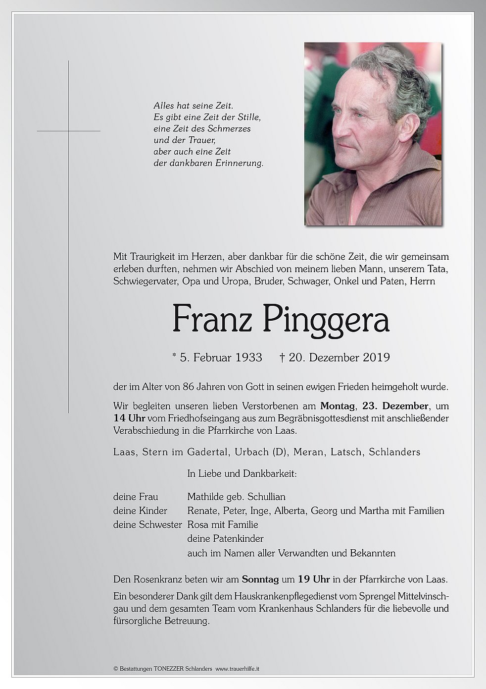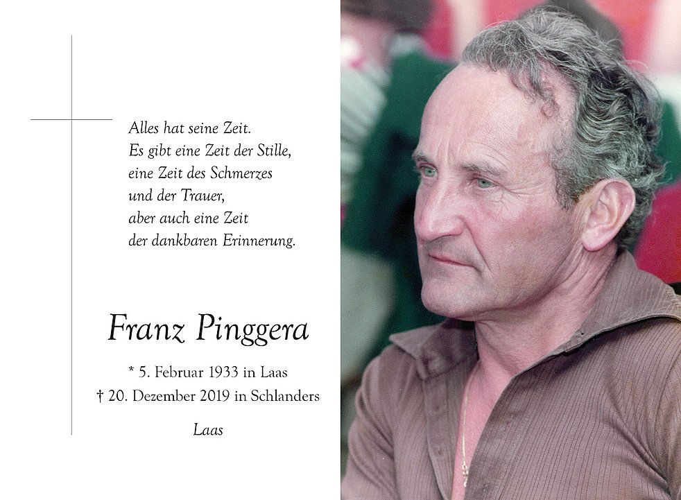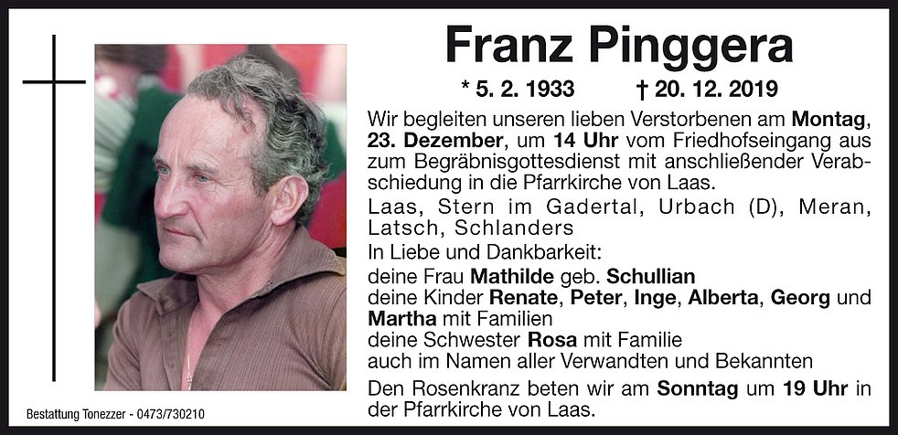 Wir begleiten unseren lieben Verstorbenen am Montag, 23. Dezember, um 14 Uhr vom Friedhofseingang aus zum Begräbnisgottesdienst mit anschließender Verabschiedung in die Pfarrkirche von Laas.