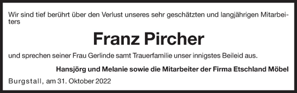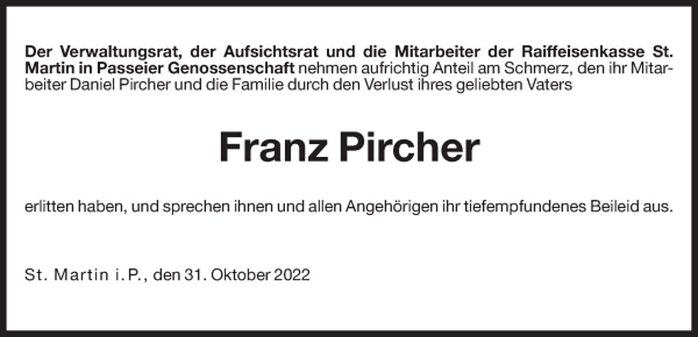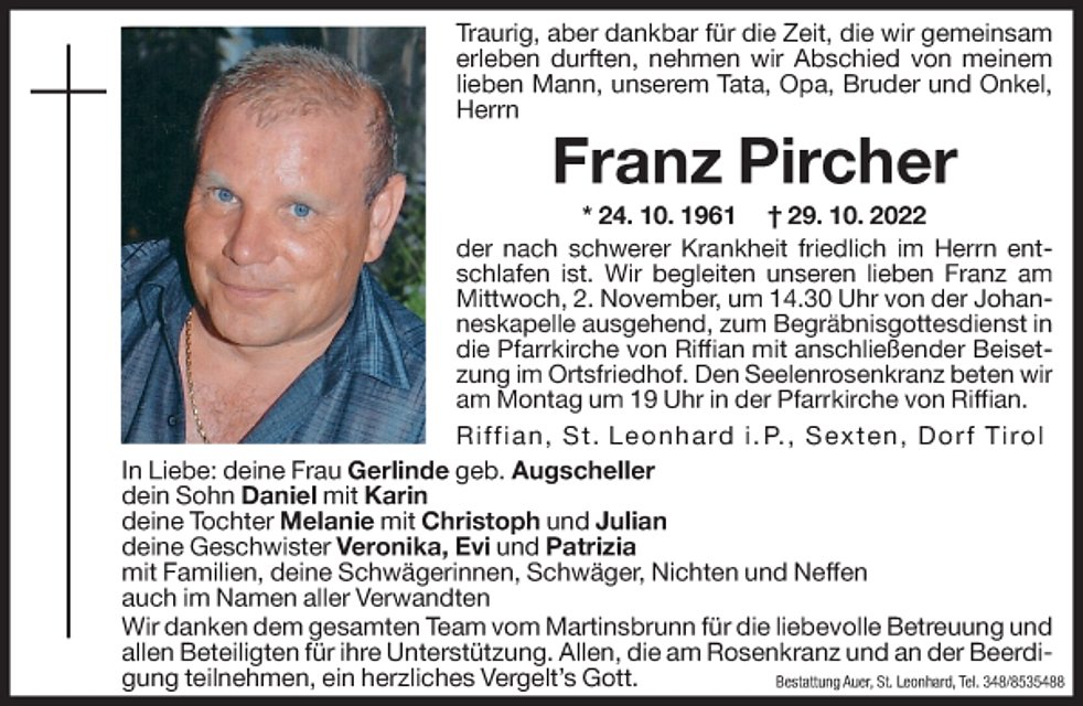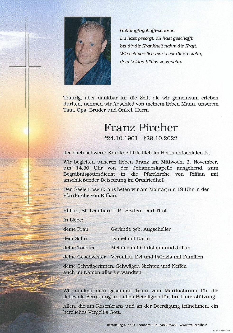 Wir begleiten unseren lieben Franz am Mittwoch, 2. November, um 14.30 Uhr von der Johanneskapelle ausgehend, zum Begräbnisgottesdienst in die Pfarrkirche von Riffian mit anschließender Beisetzung im Ortsfriedhof.