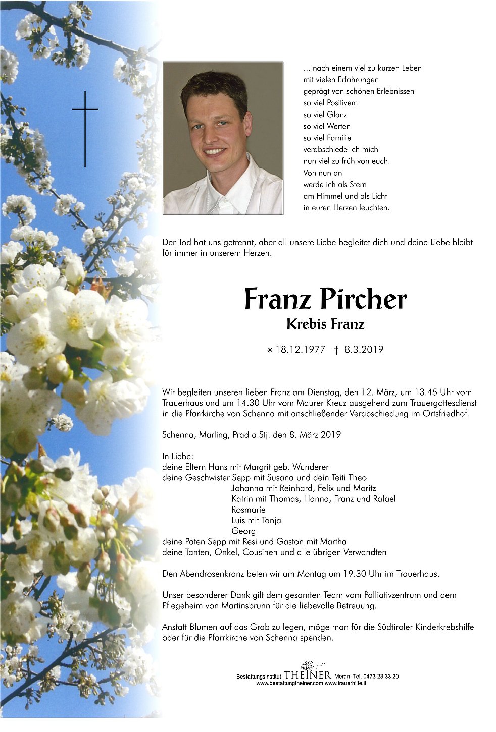 Wir begleiten unseren lieben Franz am Dienstag, den 12. März, um 13.45 Uhr vom Trauerhaus und um 14.30 Uhr vom Maurer Kreuz ausgehend zum Trauergottesdienst in die Pfarrkirche von Schenna mit anschließender Verabschiedung im Ortsfriedhof.