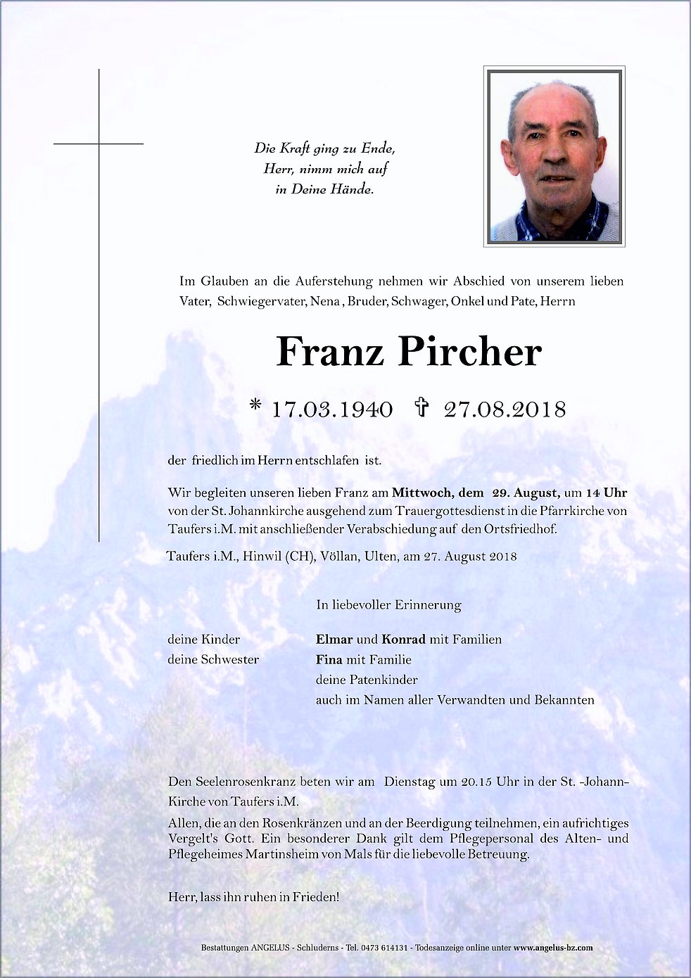 Wir begleiten unseren lieben Franz am Mittwoch, dem 29. August, um 14 Uhr von der St.-Johann-Kirche ausgehend zum Trauergottesdienst in die Pfarrkirche von Taufers i.M. mit anschließender Verabschiedung auf den Ortsfriedhof.