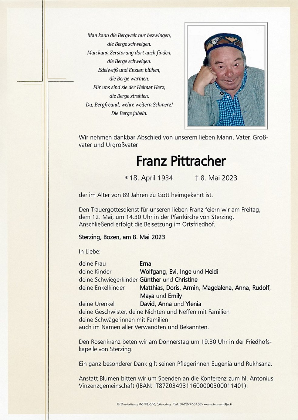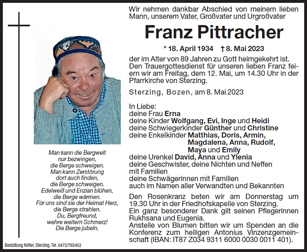 Den Trauergottesdienst für unseren lieben Franz feiern wir am Freitag, dem 12. Mai, um 14.30 Uhr in der Pfarrkirche von Sterzing. Anschließend erfolgt die Beisetzung im Ortsfriedhof.