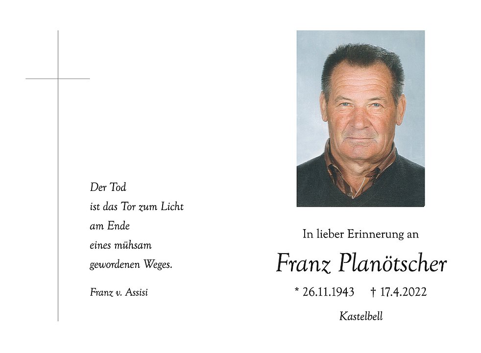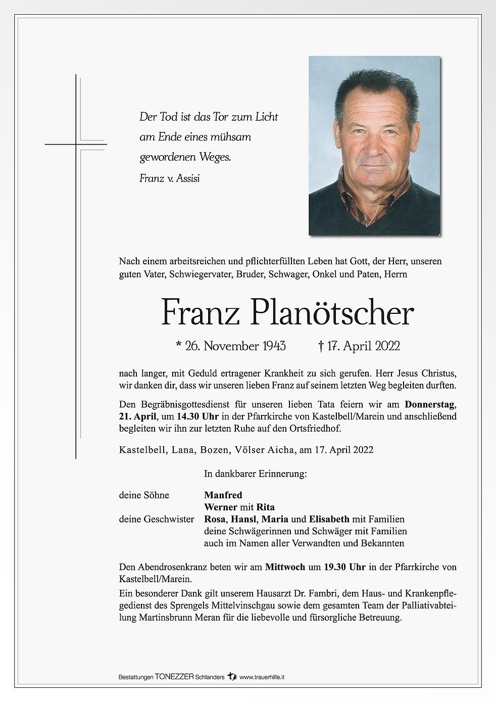 Den Begräbnisgottesdienst für unseren lieben Tata feiern wir am Donnerstag, 21. April, um 14.30 Uhr in der Pfarrkirche von Kastelbell/Marein und anschließend begleiten wir ihn zur letzten Ruhe auf den Ortsfriedhof.