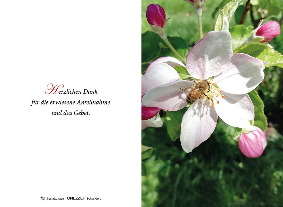 Ein besonderer Dank gilt unserem Hausarzt Dr. Fambri, dem Haus- und Krankenpflegedienst des Sprengels Mittelvinschgau sowie dem gesamten Team der Palliativabteilung Martinsbrunn Meran für die liebevolle und fürsorgliche Betreuung.