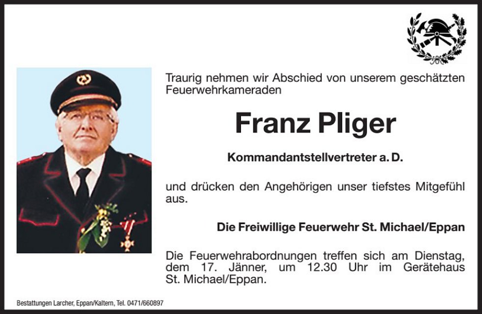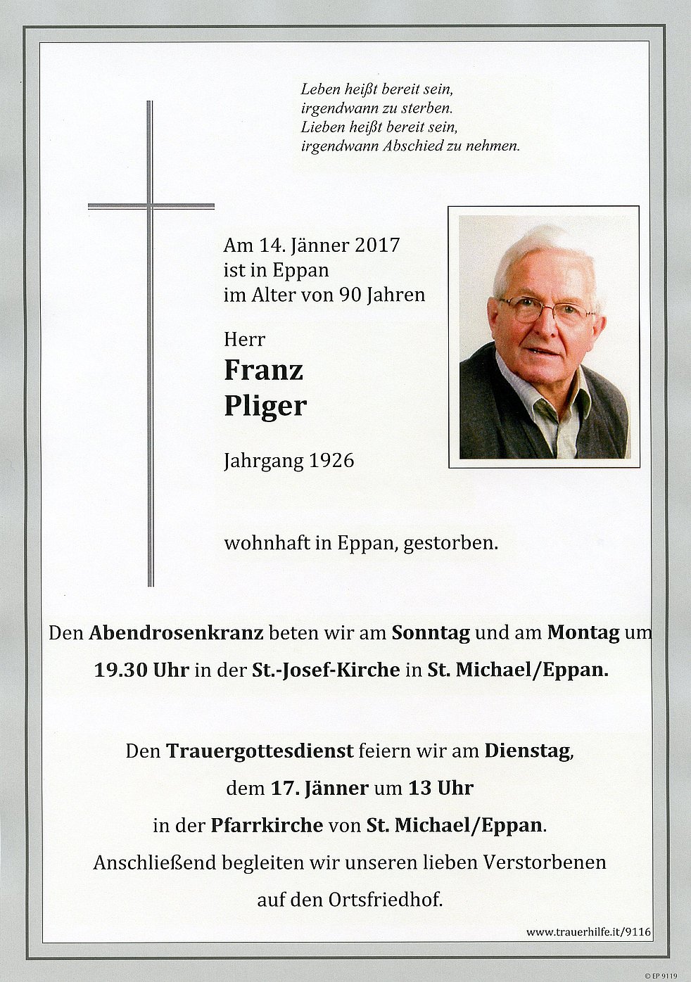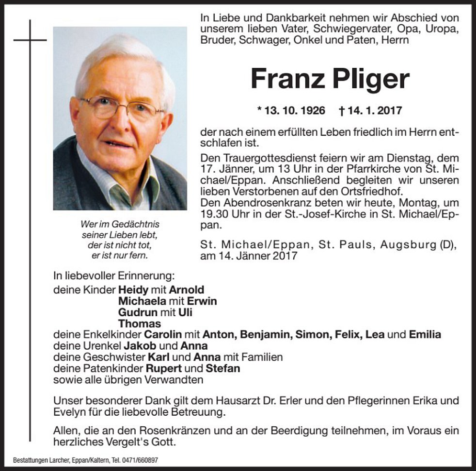 Den Trauergottesdienst feiern wir am Dienstag, den 17. Jänner um 13 Uhr in der Pfarrkirche von St. Michael/Eppan. Anschließend begleiten wir unseren lieben Verstorbenen auf den Ortsfriedhof.