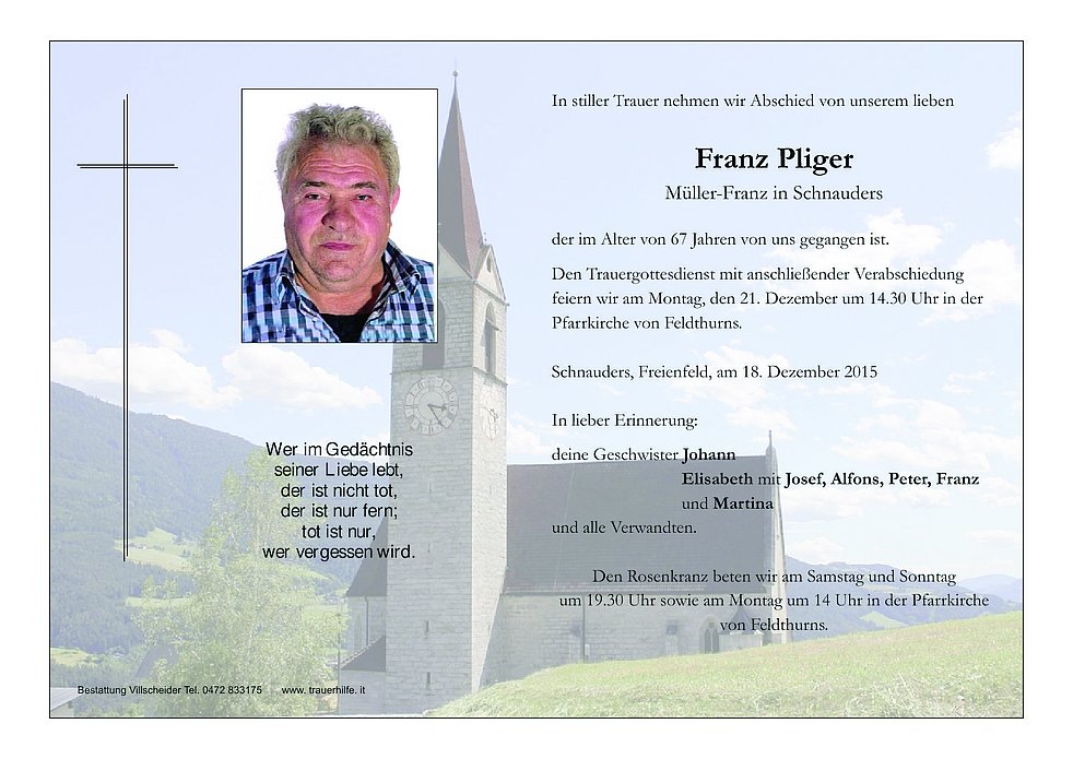 Den Trauergottesdienst mit anschließender Verabschiedung feiern wir am Montag, den 21. Dezember um 14.30 Uhr in der Pfarrkirche von Feldthurns.
