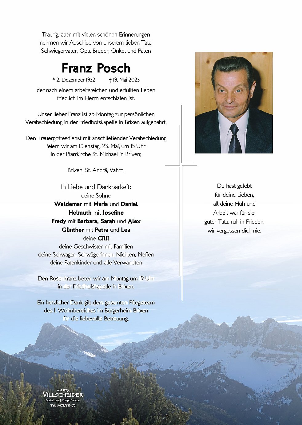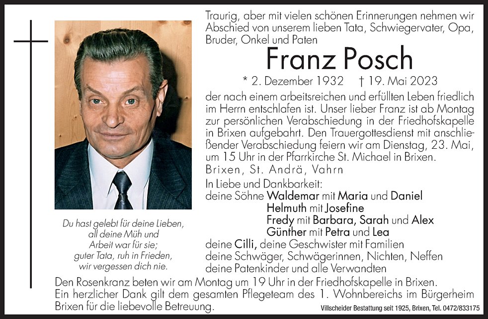 Hallo poschis, dor Franz wor für mi olm wie a Fels der olm do sein werd. Dass er nimmor do isch hot mi total erschüttert. Man woass dass der Moment irgendwonn kimb, sobold er do isch, trifft es oan dechto mitten ins Herz. Danke dafür dass i so longe a toal deiner außergewöhnlichen und wunderbaren Familie sein gelerft hon. I wünsch in die 4 Poschis schöne Gedonkn an die besondere Zeit mit ihren Votor. Alles Liebe Maria.E.