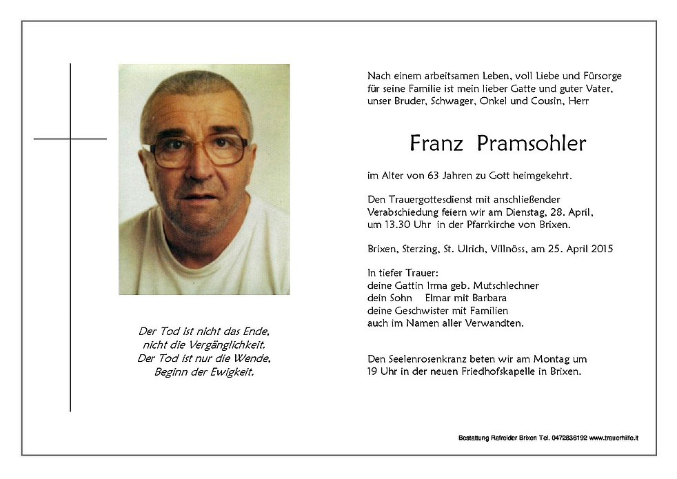 Gedankt sei dem Hausarzt Dr. Bruno Letrari und dem Hauspflegedienst Sprengl Brixen für die liebevolle Betreuung, sowie allen, die am Rosenkranz und an der Verabschiedung teilnehmen.
