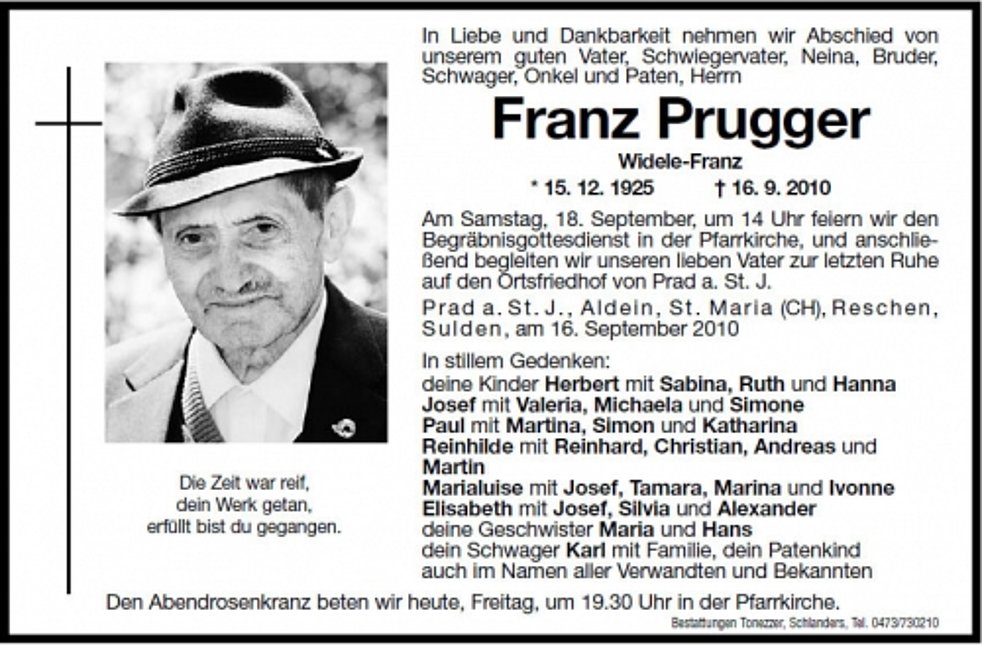 Am Samstag, 18. September, um 14 Uhr feiern wir den Begräbnisgottesdienst in der Pfarrkirche und anschließend begleiten wir unseren lieben Vater zur letzten Ruhe auf den Ortsfriedhof von Prad a.Stj.