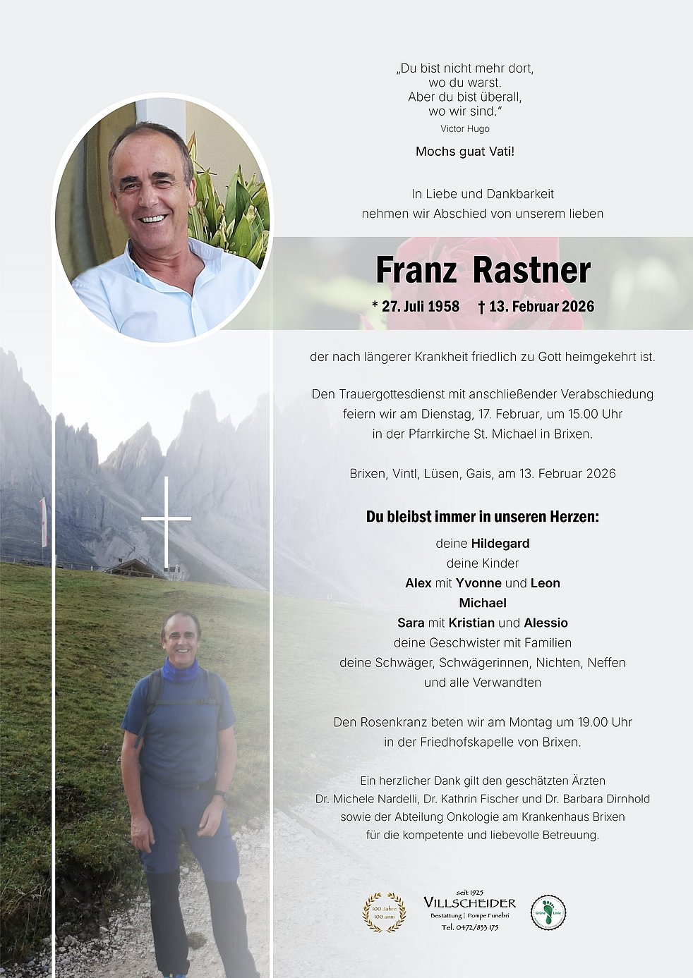 Begräbnisgottesdienst: 17.02. - 15:00 Uhr Brixen