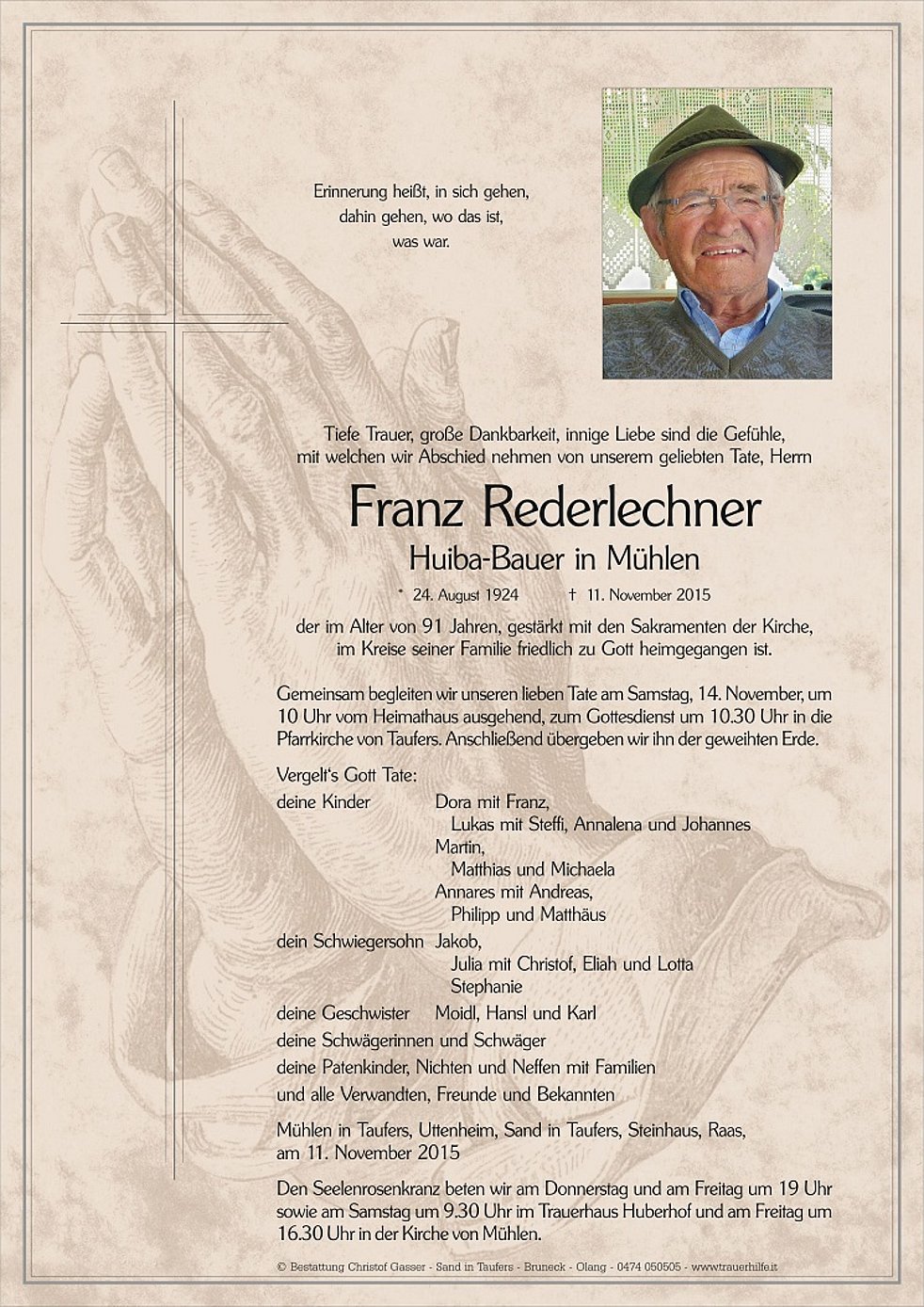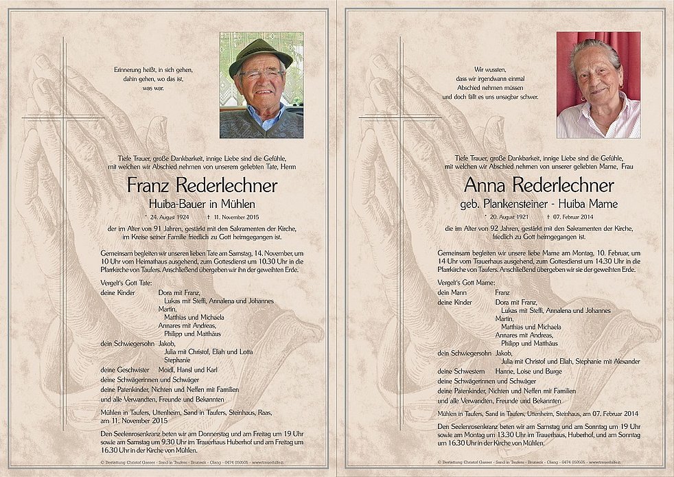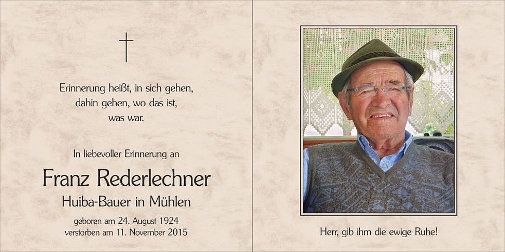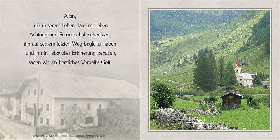 Gemeinsam begleiten wir unseren lieben Tate am Samstag, 14. November, um 10 Uhr vom Heimathaus ausgehend, zum Gottesdienst um 10.30 Uhr in die Pfarrkirche von Taufers. Anschließend übergeben wir ihn der geweihten Erde.