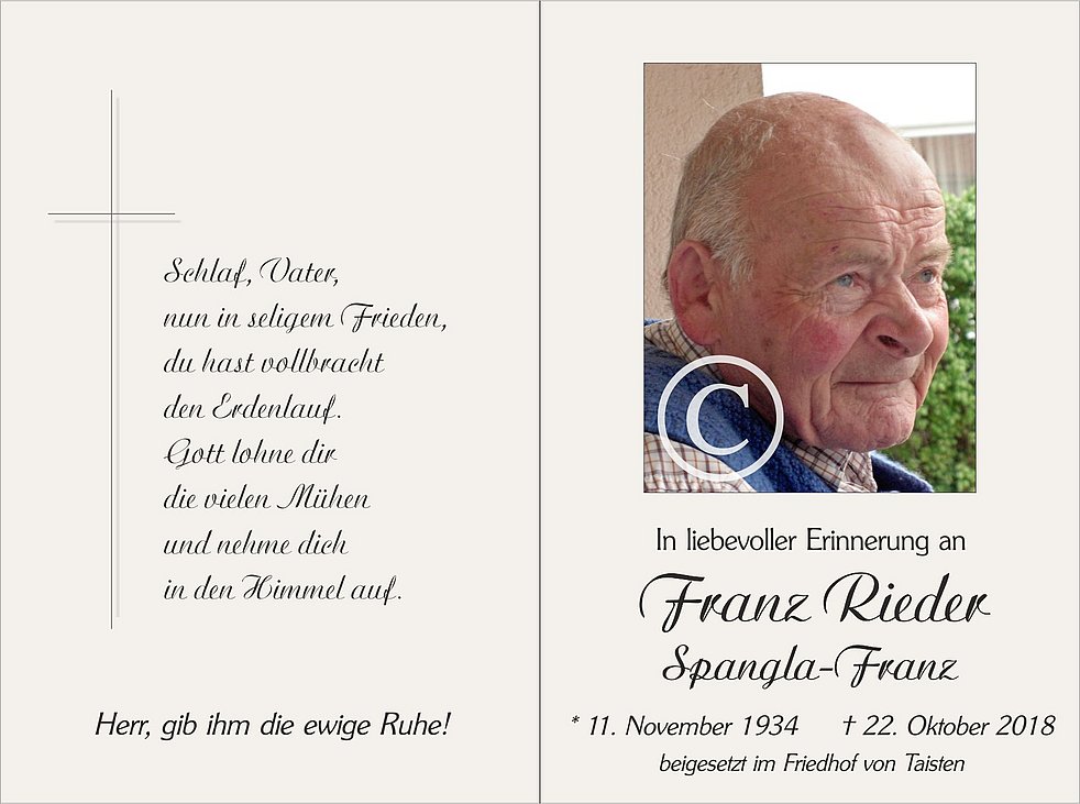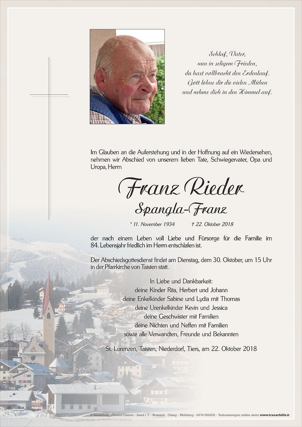 Im Glauben an die Auferstehung und in der Hoffnung auf ein Wiedersehen, nehmen wir Abschied von unserem lieben Tate, Schwiegervater, Opa und Uropa, Herrn