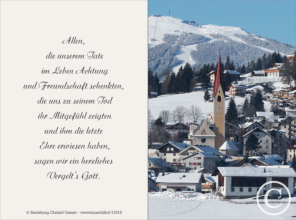 Der Abschiedsgottesdienst findet am Dienstag, dem 30. Oktober, um 15 Uhr in der Pfarrkirche von Taisten statt.