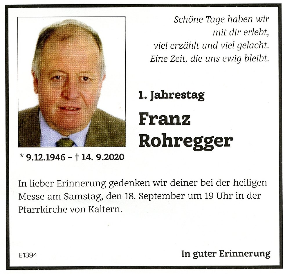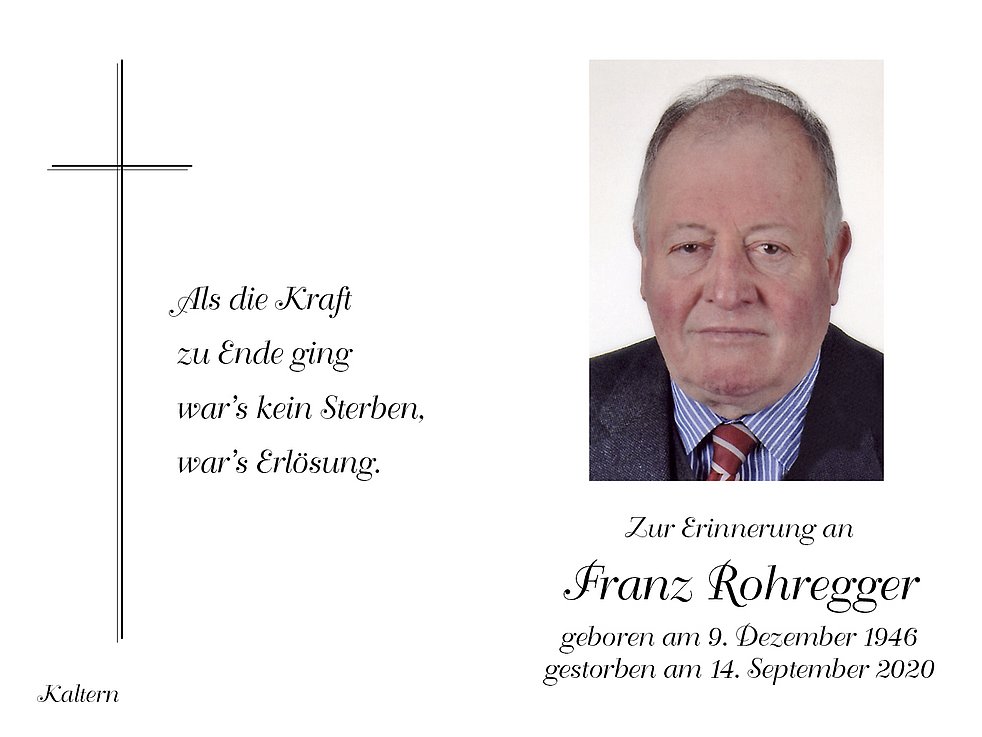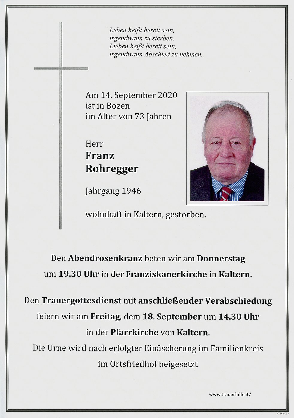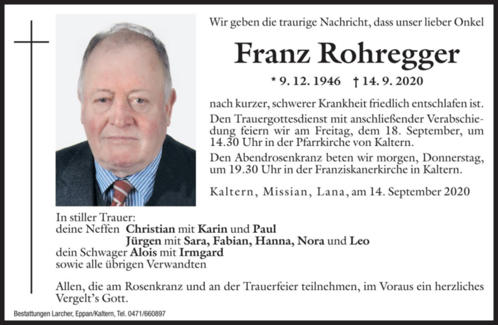 Den Trauergottesdienst mit anschließender Verabschiedung feiern wir am Freitag, dem 18. September um 14.30 Uhr in der Pfarrkirche von Kaltern. Den Abendrosenkranz beten wir morgen Donnerstag, um 19.30 Uhr in der Franziskanerkirche in Kaltern.