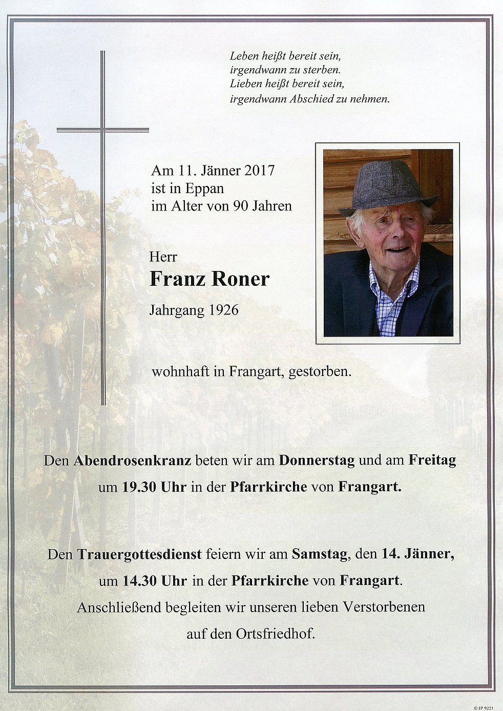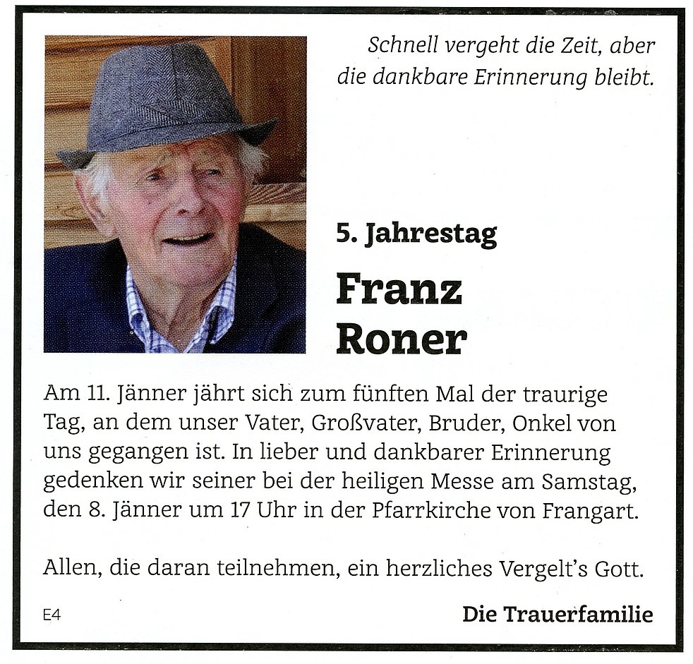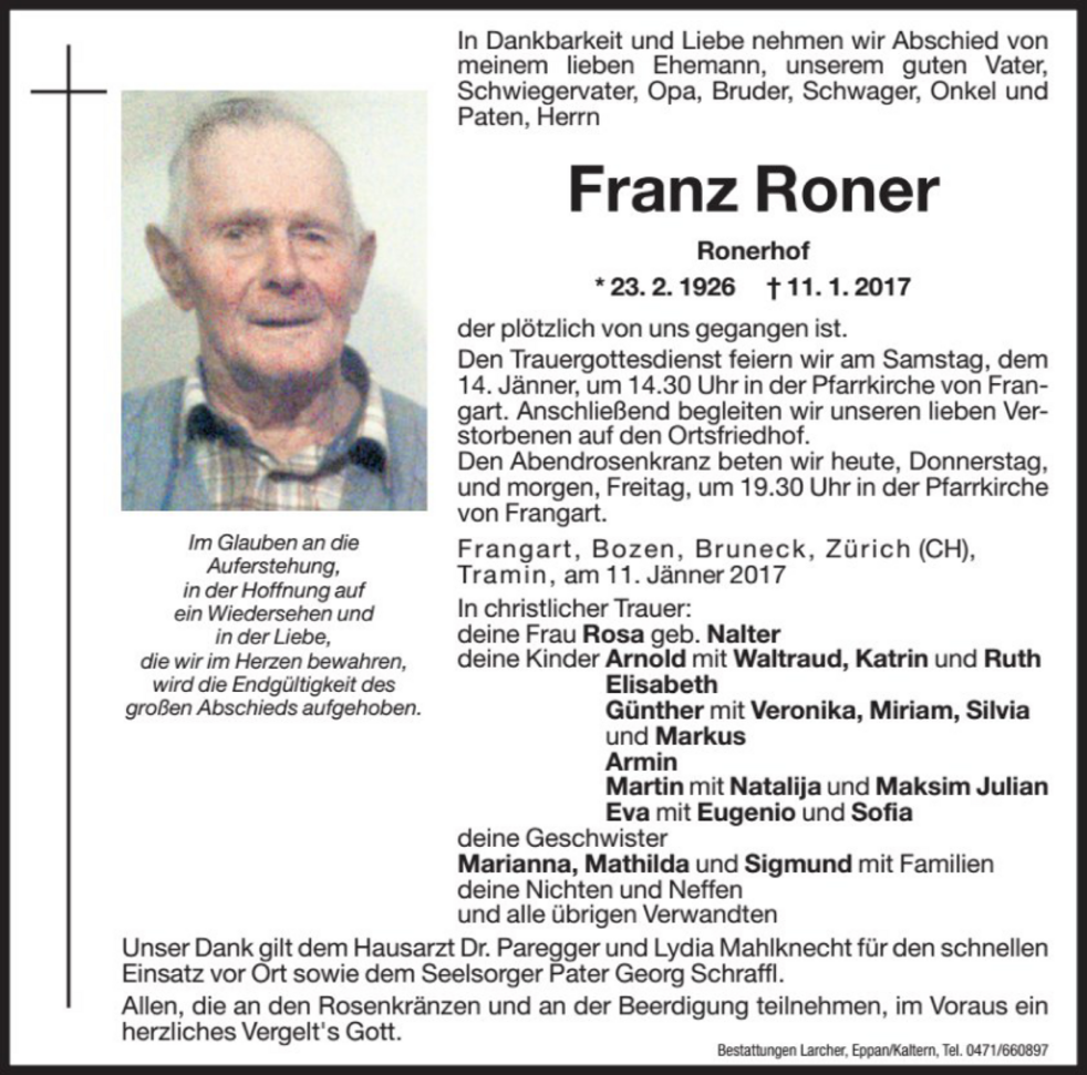 Den Trauergottesdienst feiern wir am Samstag, den 14. Jänner um 14.30 Uhr in der Pfarrkirche von Frangart. Anschließend begleiten wir unseren lieben Verstorbenen auf den Ortsfriedhof.