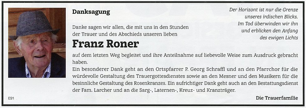 Unser Dank gilt dem Hausarzt Dr. Paregger und Lydia Mahlknecht für den schnellen Einsatz vor Ort sowie dem Seelsorger Pater Georg Schraffl.