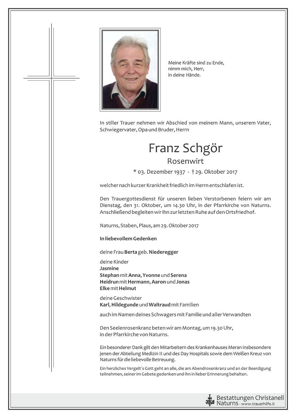 Den Trauergottesdienst für unseren lieben Verstorbenen feiern wir am Dienstag, den 31. Oktober, um 14.30 Uhr, in der Pfarrkirche von Naturns. Anschließend begleiten wir ihn zur letzten Ruhe auf den Ortsfriedhof.