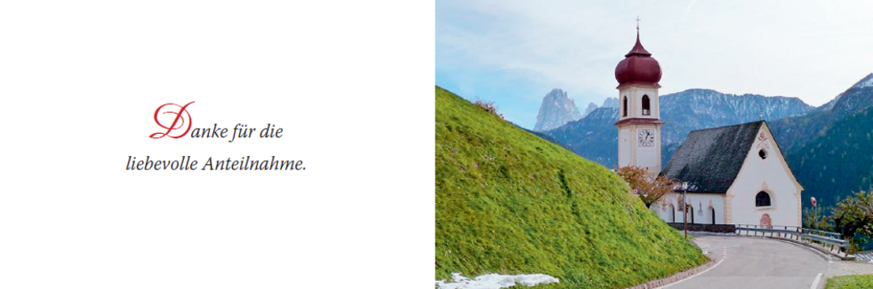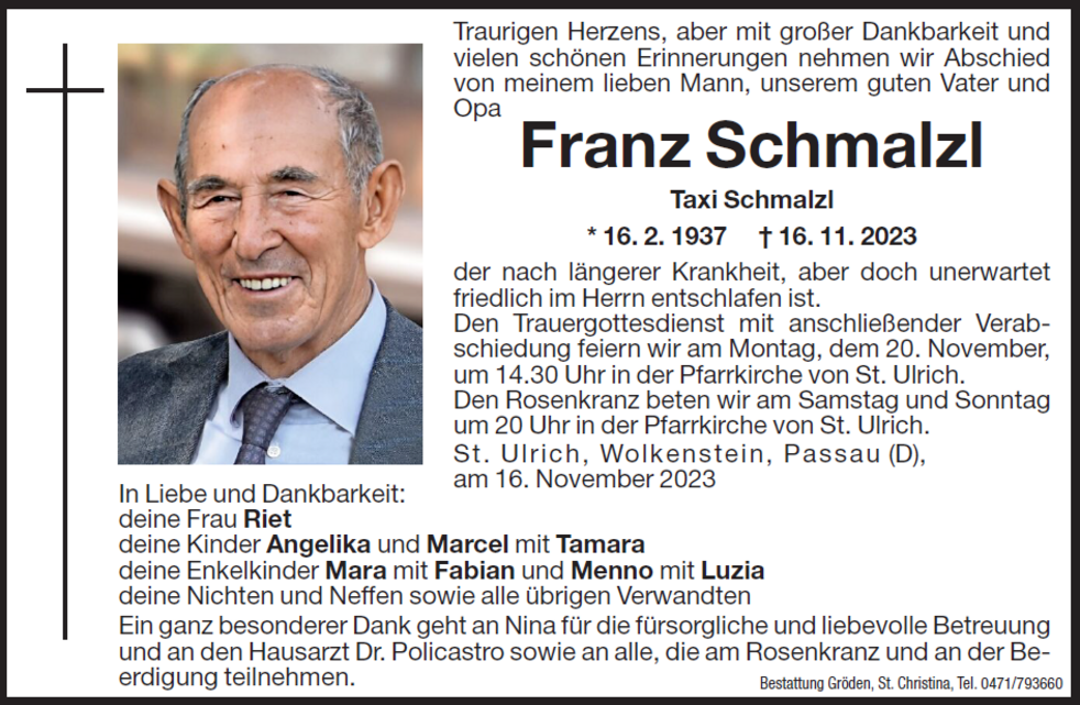 Den Trauergottesdienst mit anschließender Verabschiedung feiern wir am Montag, dem 20. November, um 14.30 in der Pfarrkirche von St. Ulrich.