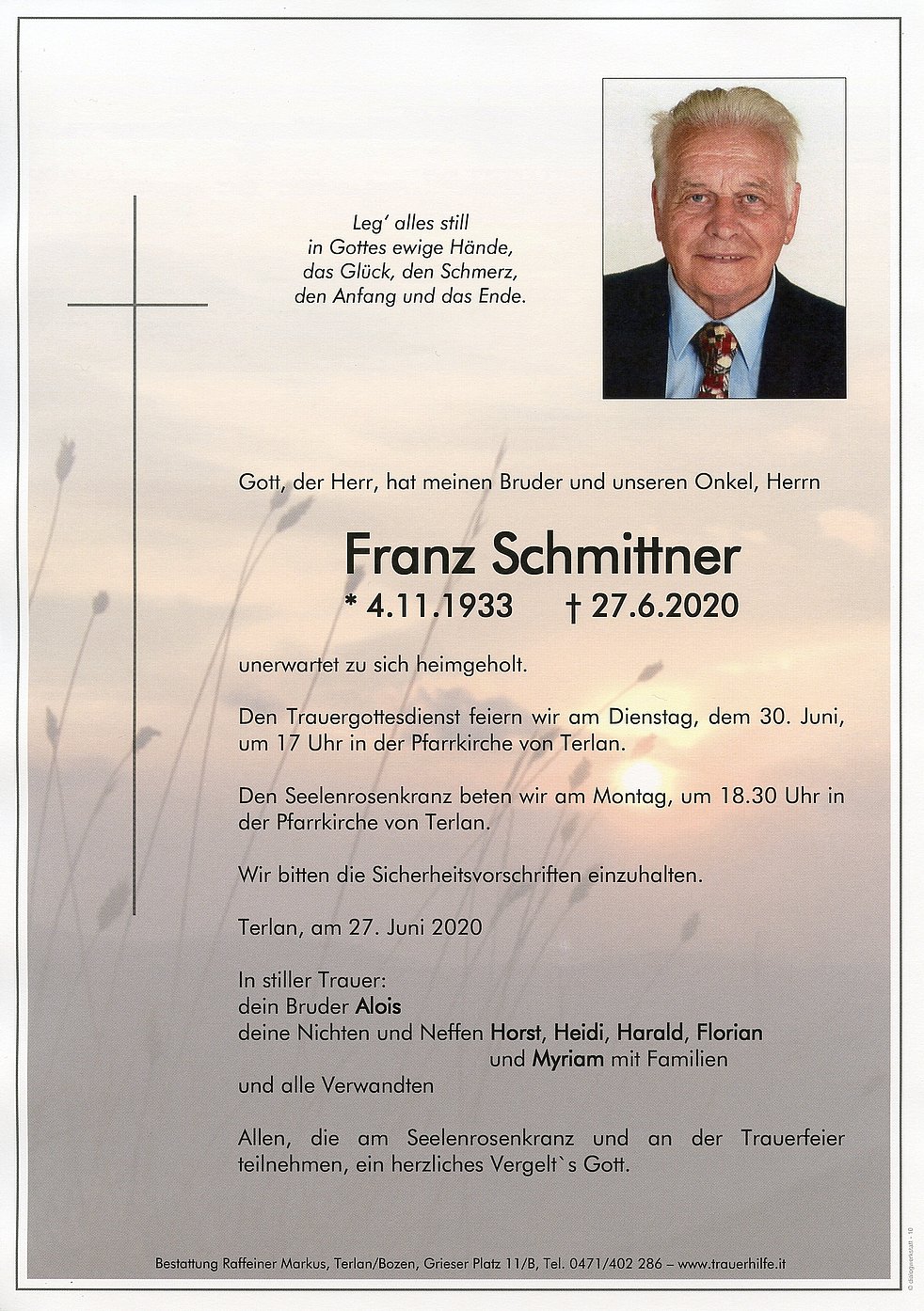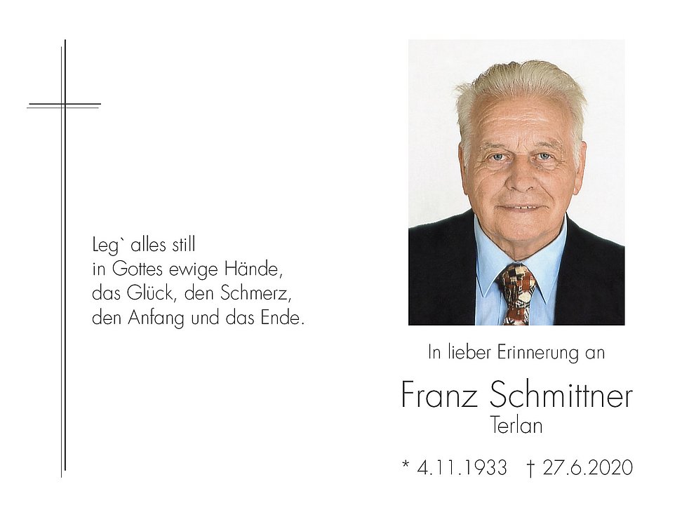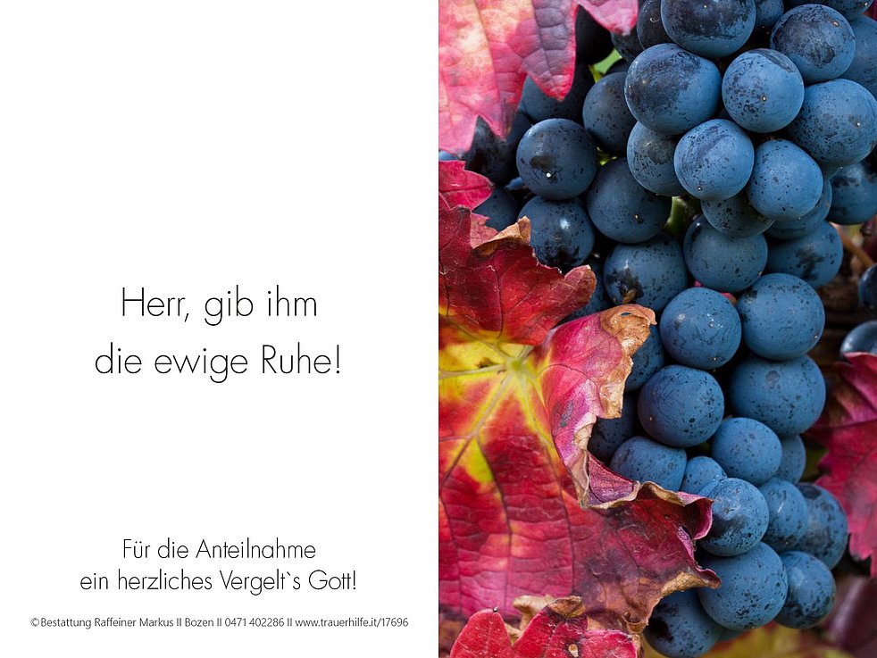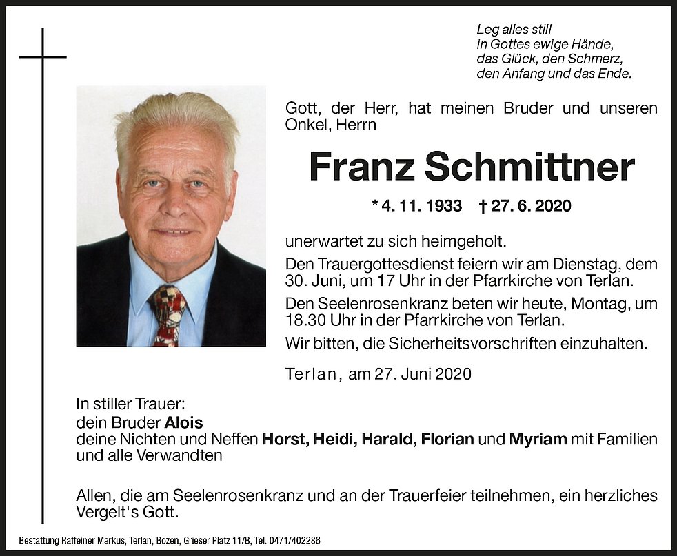 Den Trauergottesdienst feiern wir am Dienstag, dem 30. Juni, um 17 Uhr in der Pfarrkirche von Terlan.