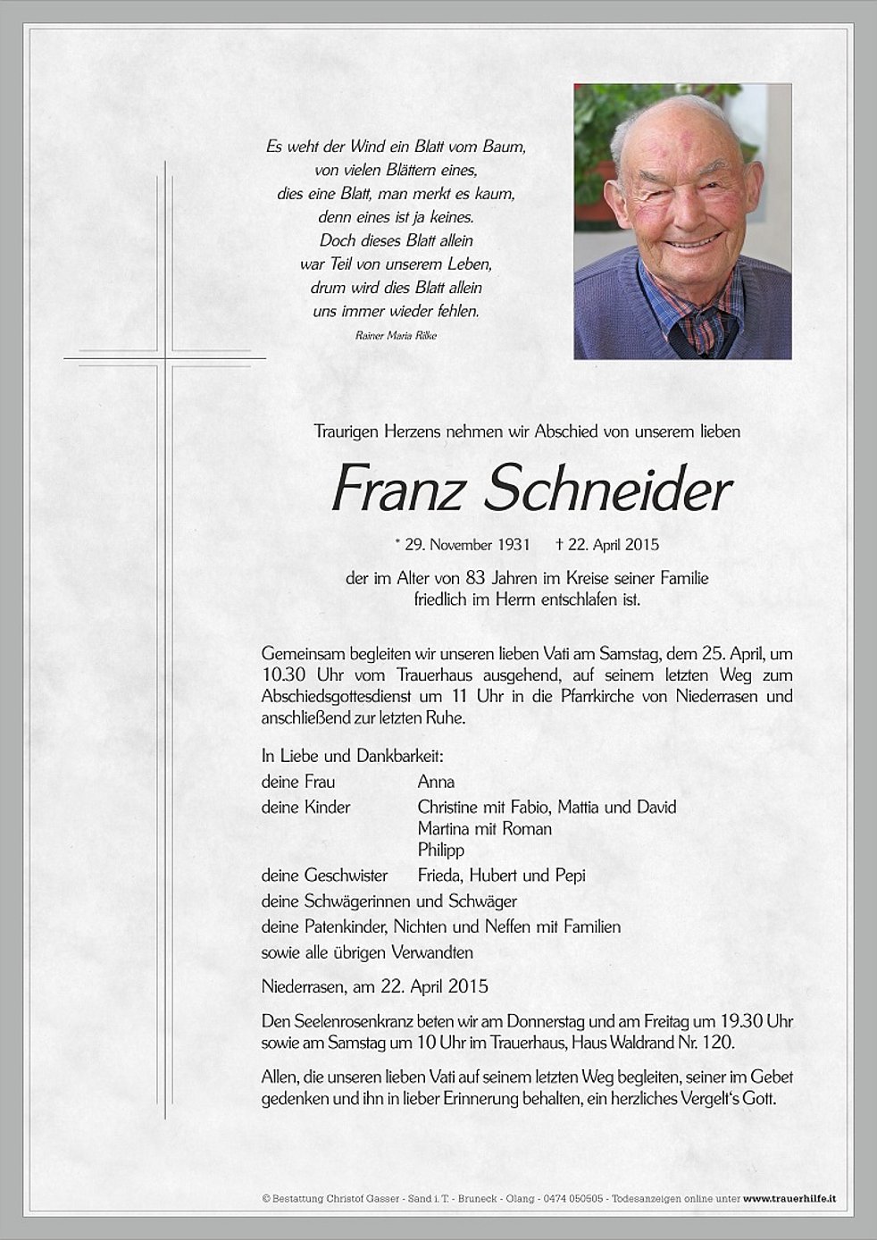 Gemeinsam begleiten wir unseren lieben Vati am Samstag, dem 25. April, um 10.30 Uhr vom Trauerhaus ausgehend, auf seinem letzten Weg zum Abschiedsgottesdienst um 11 Uhr in die Pfarrkirche von Niederrasen und anschließend zur letzten Ruhe.
