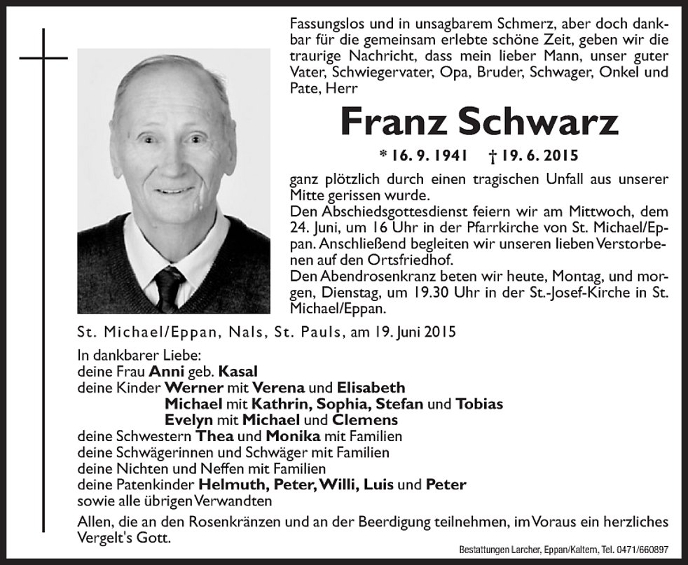 Den Abschiedsgottesdienst feiern wir am Mittwoch, dem 24. Juni, um 16 Uhr in der Pfarrkirche von St. Michael/Eppan. Anschließend begleiten wir unseren lieben Verstorbenen auf den Ortsfriedhof.