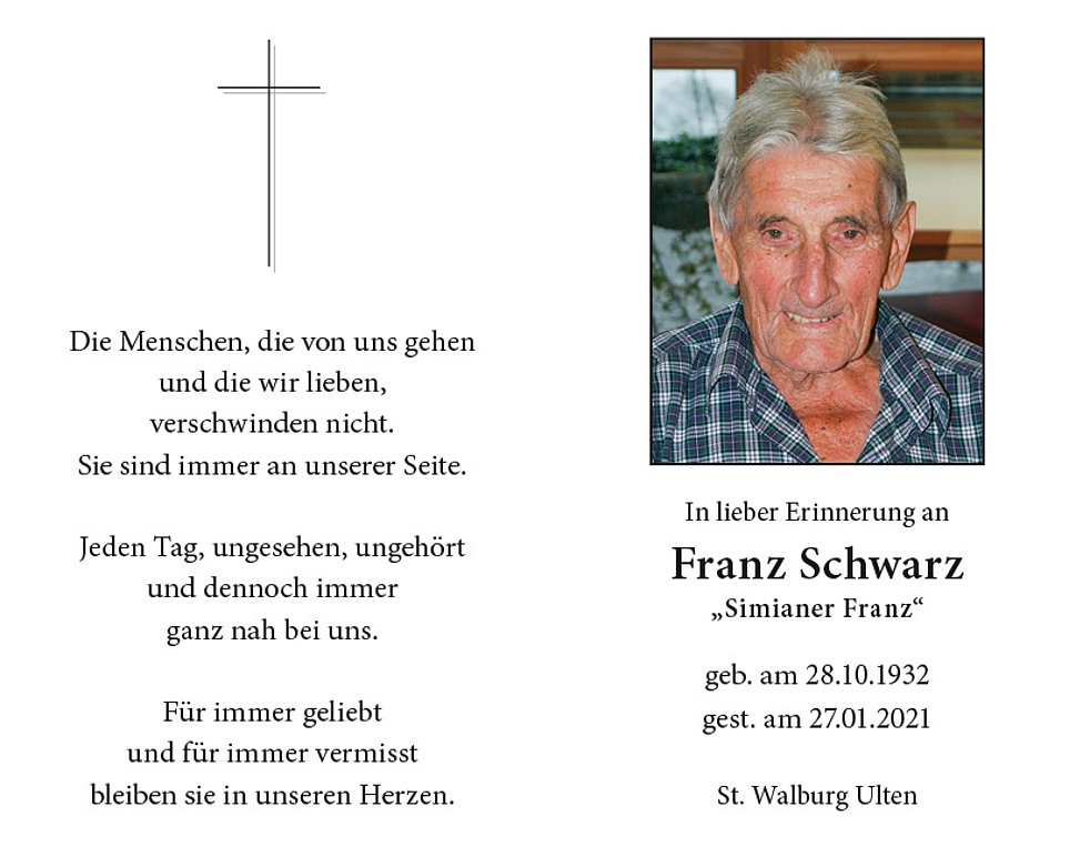 Gemeinsam beten wir für unseren lieben Tata und Opa am Freitag um 19.30 Uhr, sowie am Samstag um 14.00 Uhr, in der Pfarrkirche von St. Walburg.