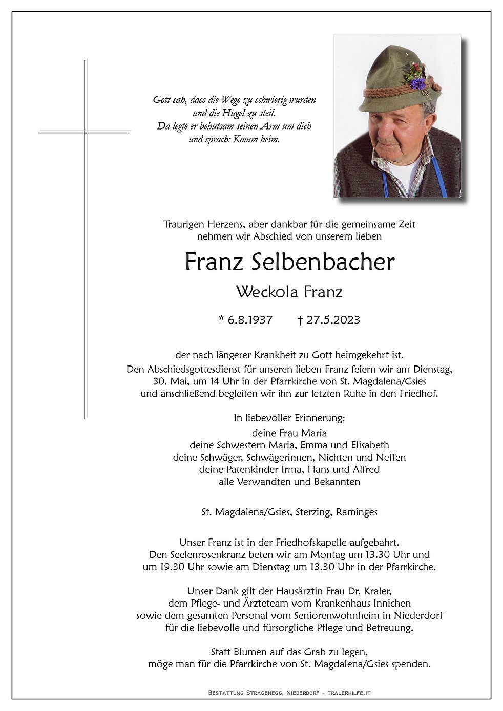 Lieber Franz , gerne hätten wir dich noch einmal besucht , doch Gott bestimmte deine Zeit zu gehen. Dein Tod ist für uns jetzt jedoch recht überraschend. Wir werden dich als sehr geselligen und lebenslustigen Menschen in Erinnerung behalten. Pfiati Franz , ruhe in Frieden. Martin und Silvia