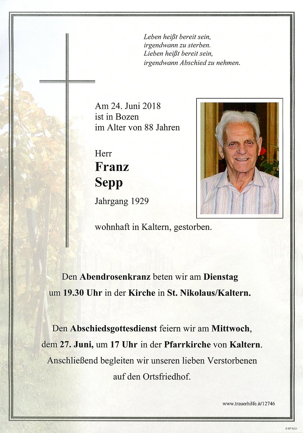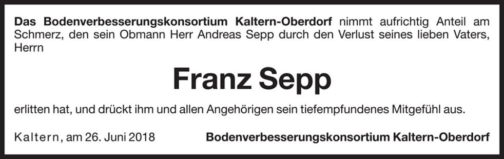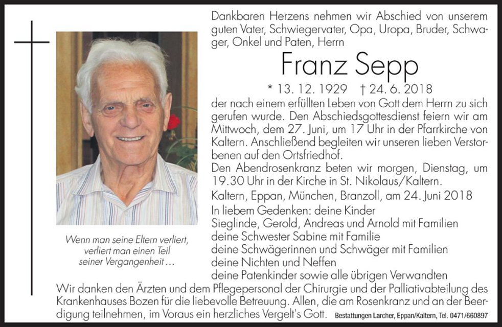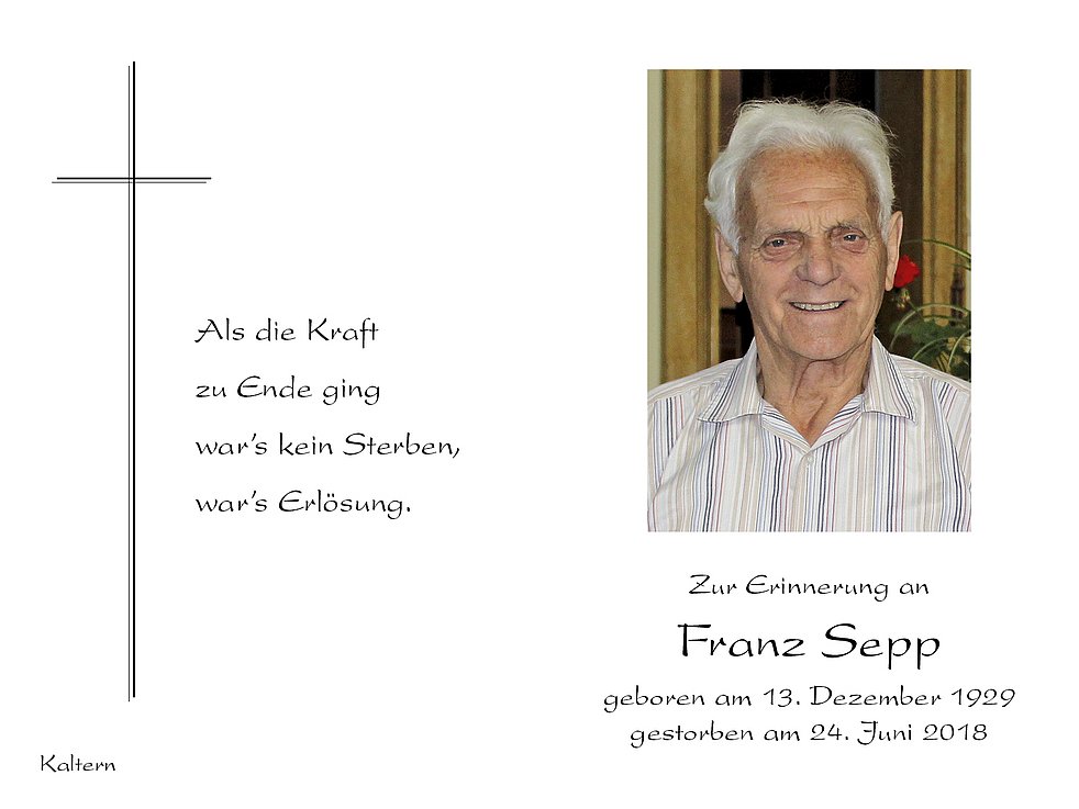 Den Abschiedsgottesdienst feiern wir am Mittwoch, dem 27. Juni um 17 Uhr in der Pfarrkirche von Kaltern. Anschließend begleiten wir unseren lieben Verstorbenen auf den Ortsfriedhof.