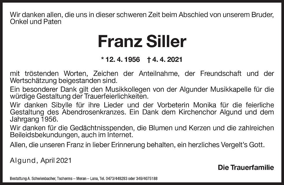 Die Trauerfeier findet am Samstag, dem 10. April, vormittags um 10.30 Uhr im Algunder Friedhof statt.