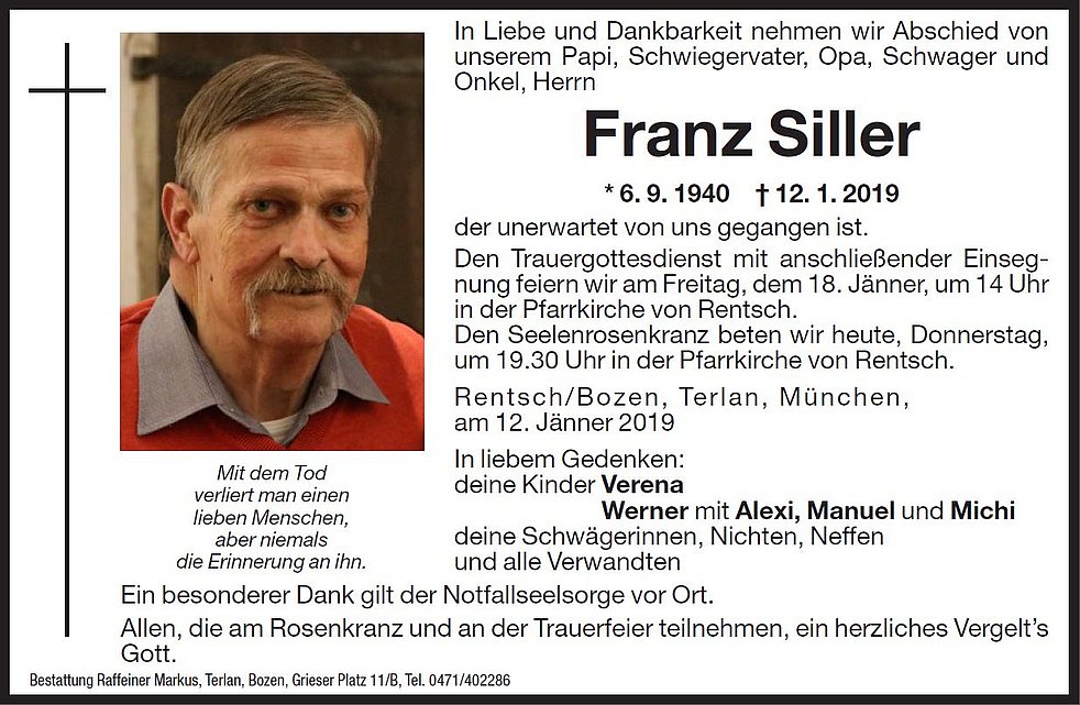 Den Trauergottesdienst mit anschließender Einsegnung feiern wir am Freitag, dem 18. Jänner, um 14 Uhr in der Pfarrkirche von Rentsch.