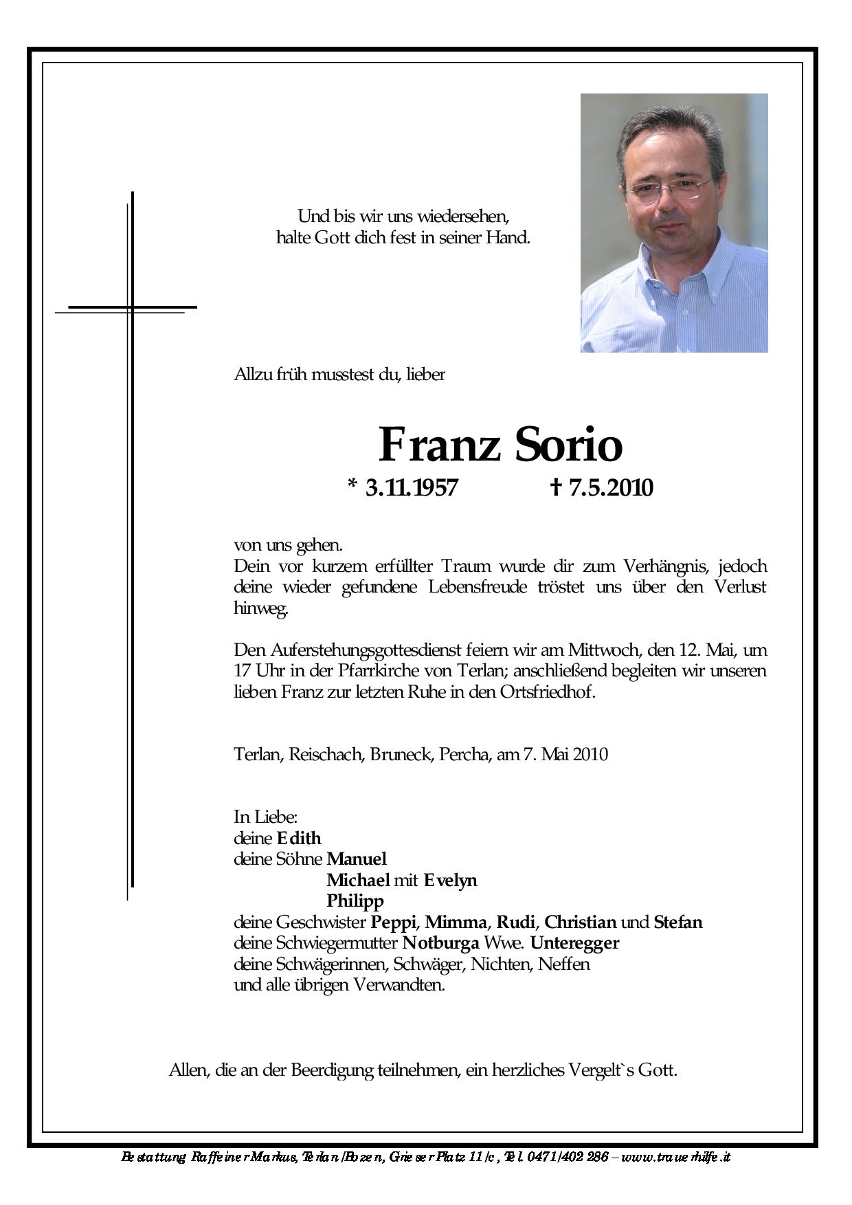 Den Auferstehungsgottesdienst feiern wir am Mittwoch, dem 12. Mai, um 17 Uhr in der Pfarrkirche von Terlan; anschließend begleiten wir unseren lieben Franz zur letzten Ruhe in den Ortsfriedhof.