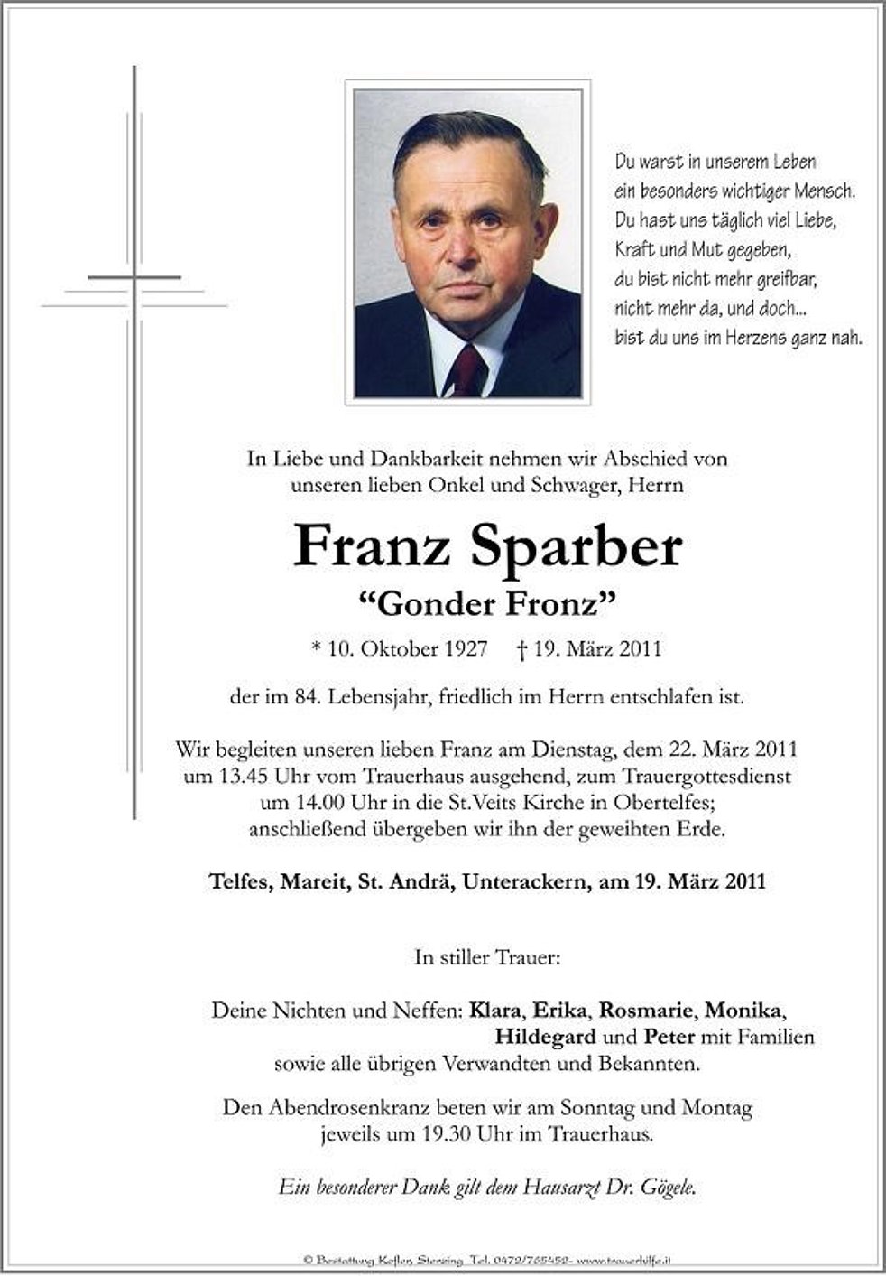 Wir begleiten unseren lieben Franz am Dienstag, dem 22. März 2011 um 13.45 Uhr