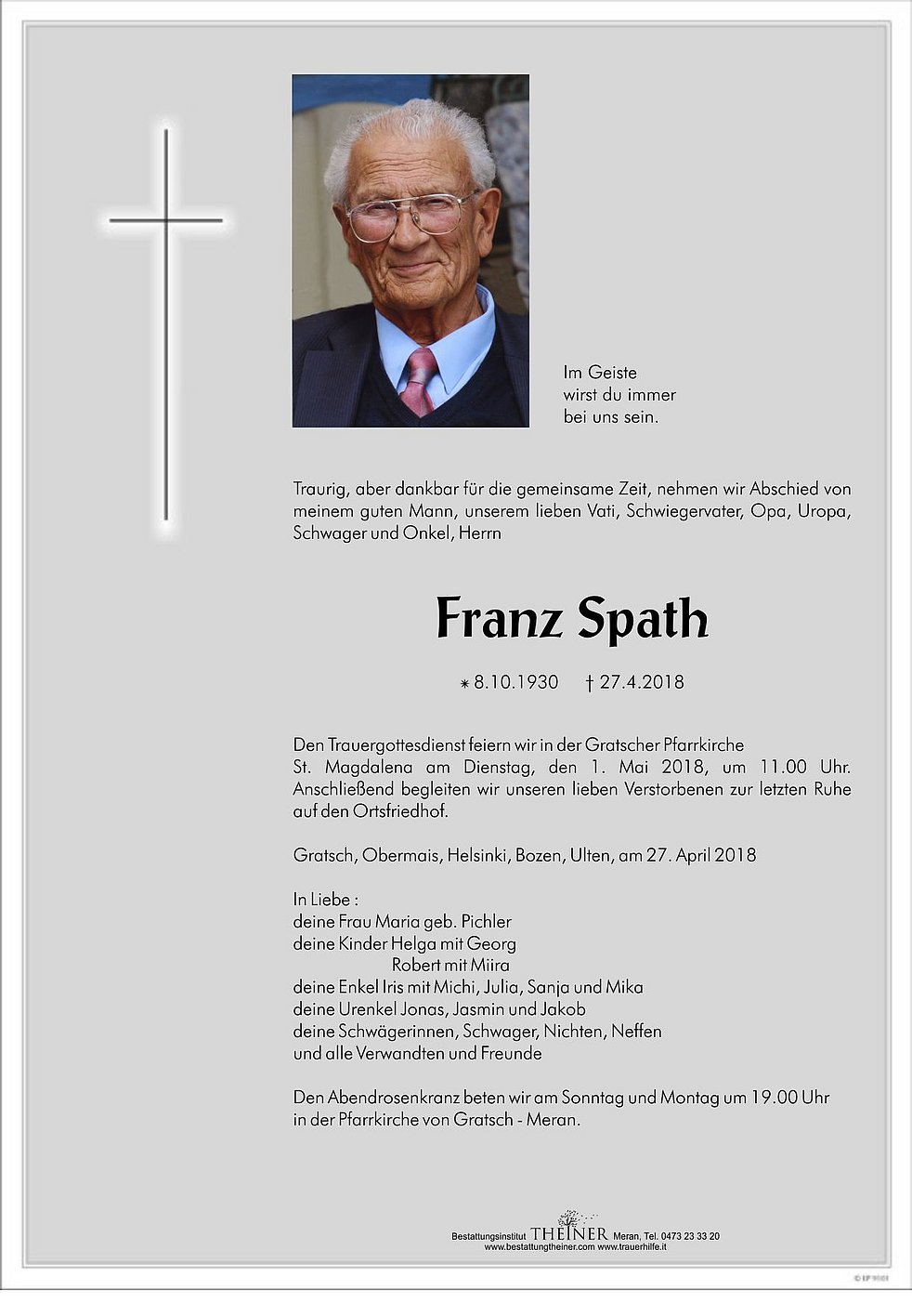 Den Trauergottesdienst feiern wir in der Gratscher Pfarrkirche