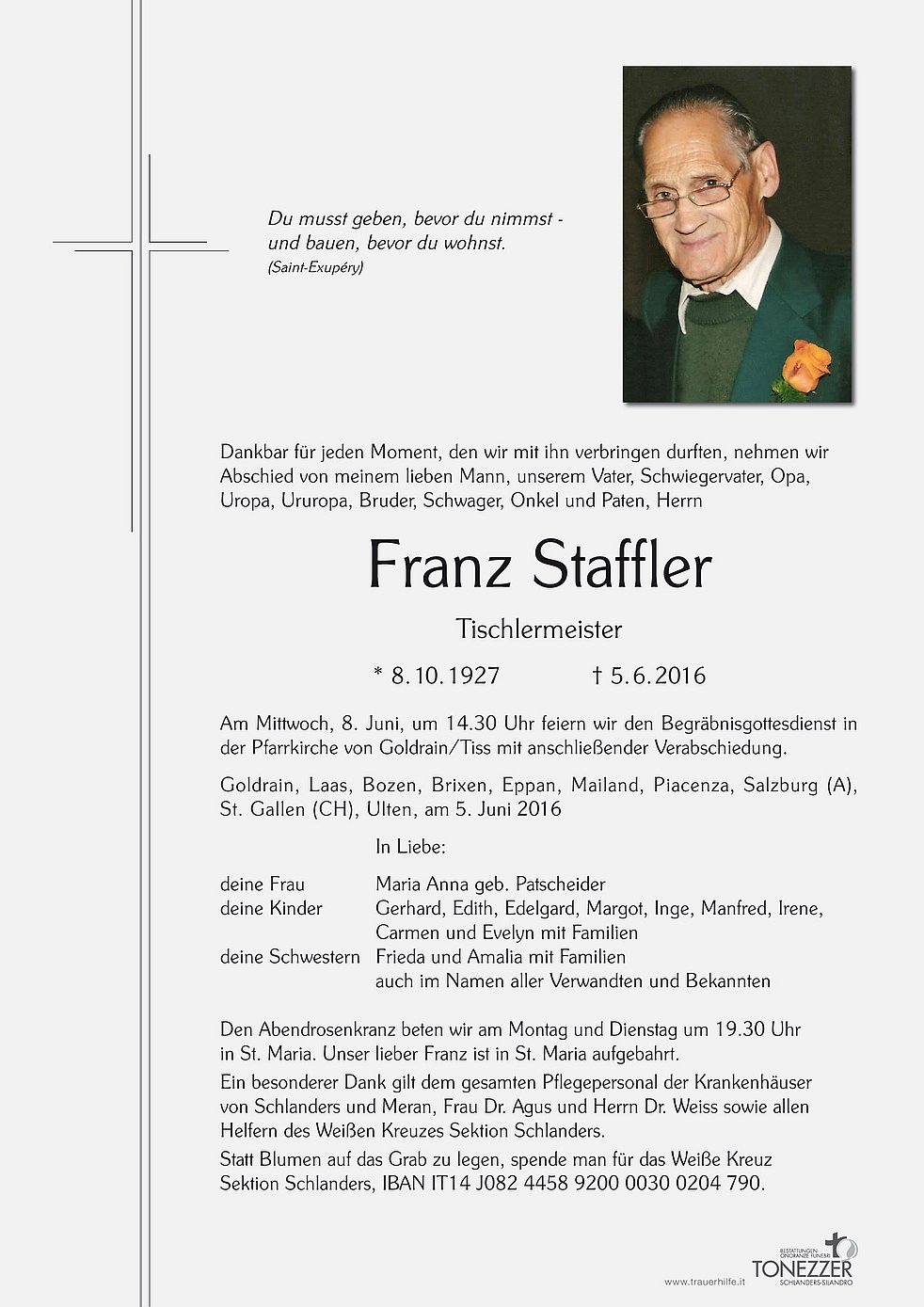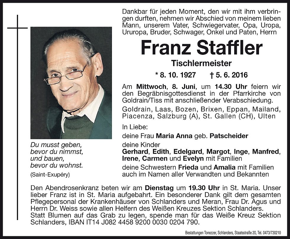 Statt Blumen auf das Grab zu legen, spende man für das Weiße Kreuz Sektion Schlanders, IBAN IT14 J082 4458 9200 0030 0204 790.