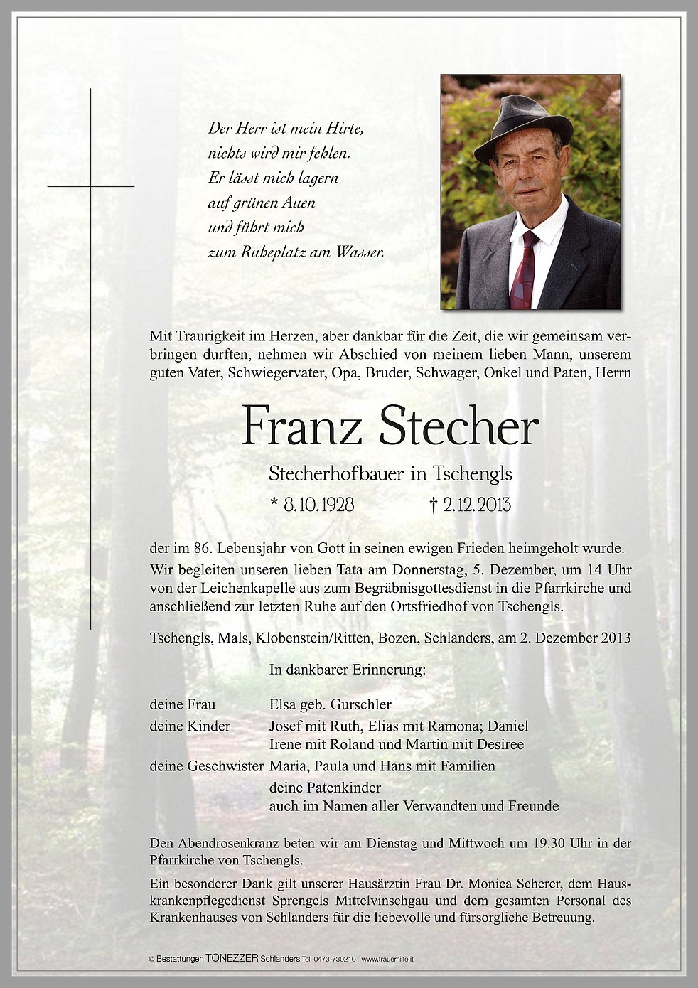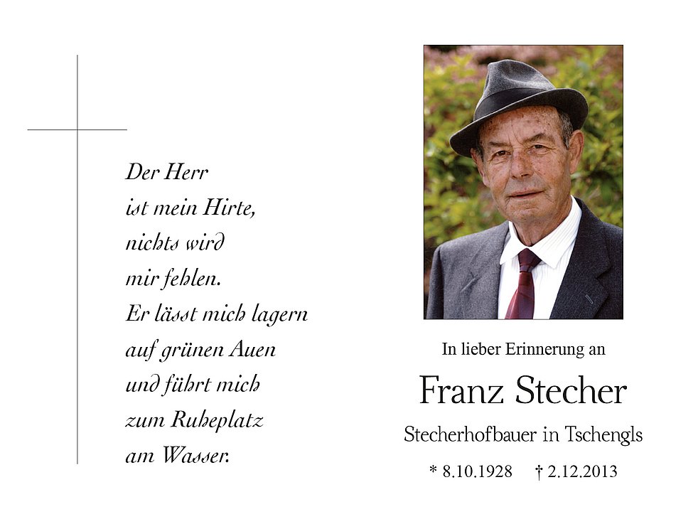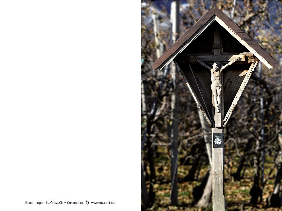 Wir begleiten unseren lieben Tata am Donnerstag, 5. Dezember, um 14 Uhr von der Leichenkapelle aus zum Begräbnisgottesdienst in die Pfarrkirche und anschließend zur letzten Ruhe auf den Ortsfriedhof von Tschengls.