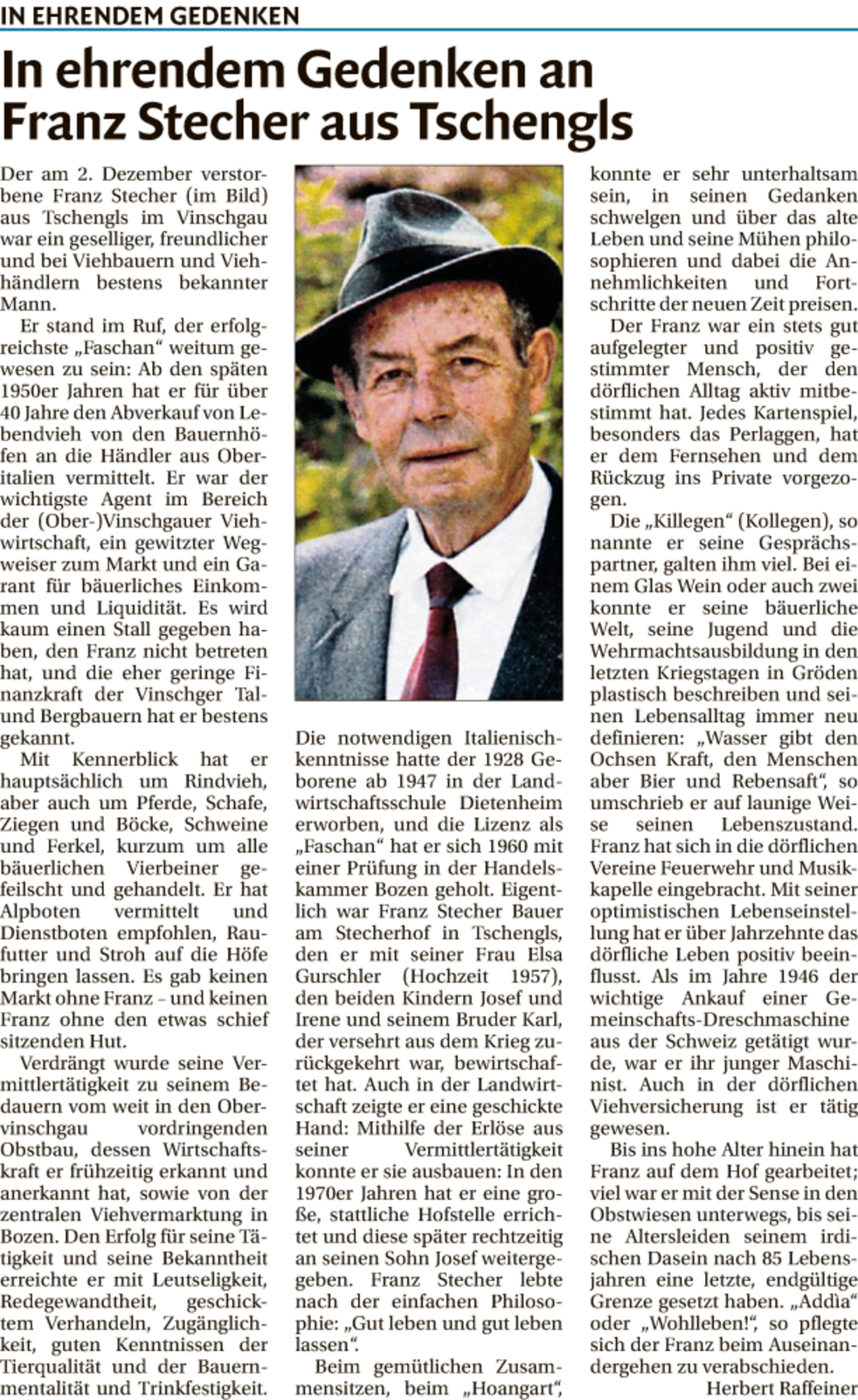 Ein besonderer Dank gilt unserer Hausärztin Frau Dr. Monica Scherer, dem Hauskrankenpflegedienst des Sprengels Mittelvinschgau und dem gesamten Personal des Krankenhauses von Schlanders für die liebevolle und fürsorgliche Betreuung.