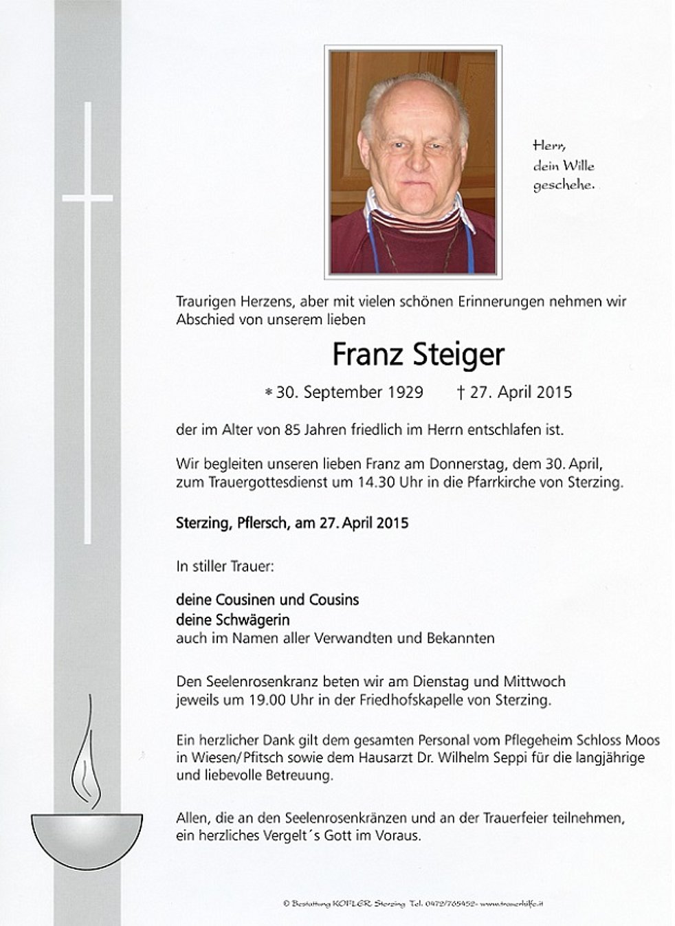 Ein herzlicher Dank gilt dem gesamten Personal vom Pflegeheim Schloss Moos in Wiesen/Pfitsch sowie dem Hausarzt Dr. Wilhelm Seppi für die langjährige und liebevolle Betreuung.