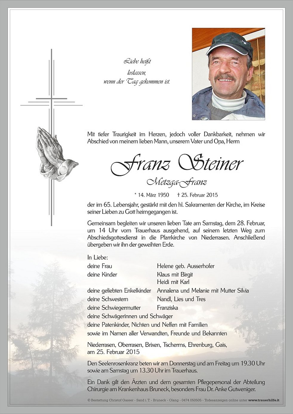 Gemeinsam begleiten wir unseren lieben Tate am Samstag, dem 28. Februar, um 14 Uhr vom Trauerhaus ausgehend, auf seinem letzten Weg zum Abschiedsgottesdienst in die Pfarrkirche von Niederrasen. Anschließend übergeben wir ihn der geweihten Erde.