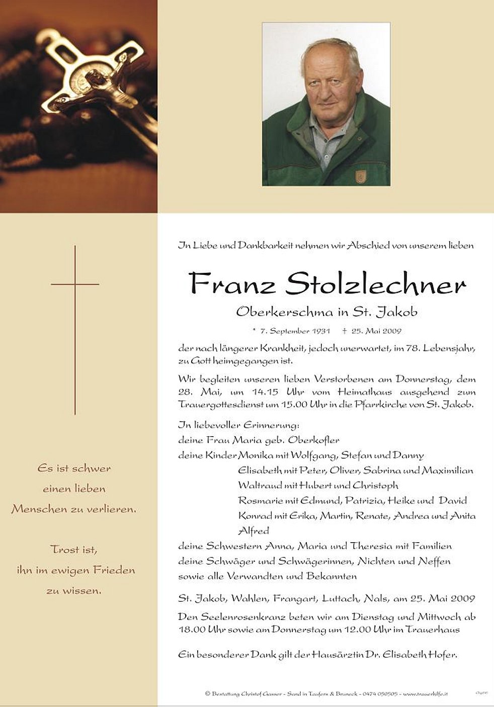 Wir begleiten unseren lieben Verstorbenen am Donnerstag, dem 28. Mai, um 14.15 Uhr vom Heimathaus ausgehend zum Trauergottesdienst um 15.00 Uhr in die Pfarrkirche von St. Jakob.