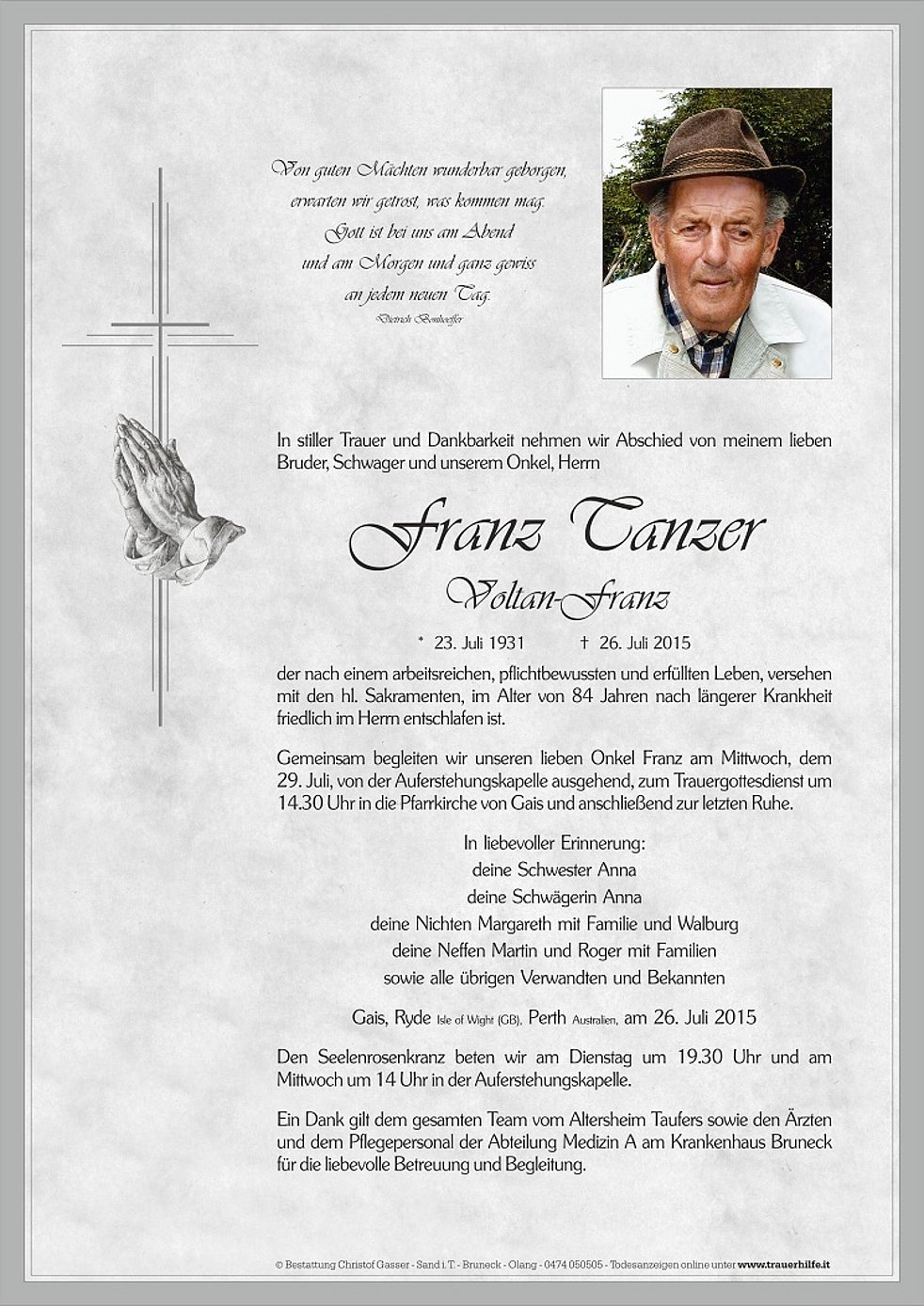 29. Juli, von der Auferstehungskapelle ausgehend, zum Trauergottesdienst um 14.30 Uhr in die Pfarrkirche von Gais und anschließend zur letzten Ruhe.